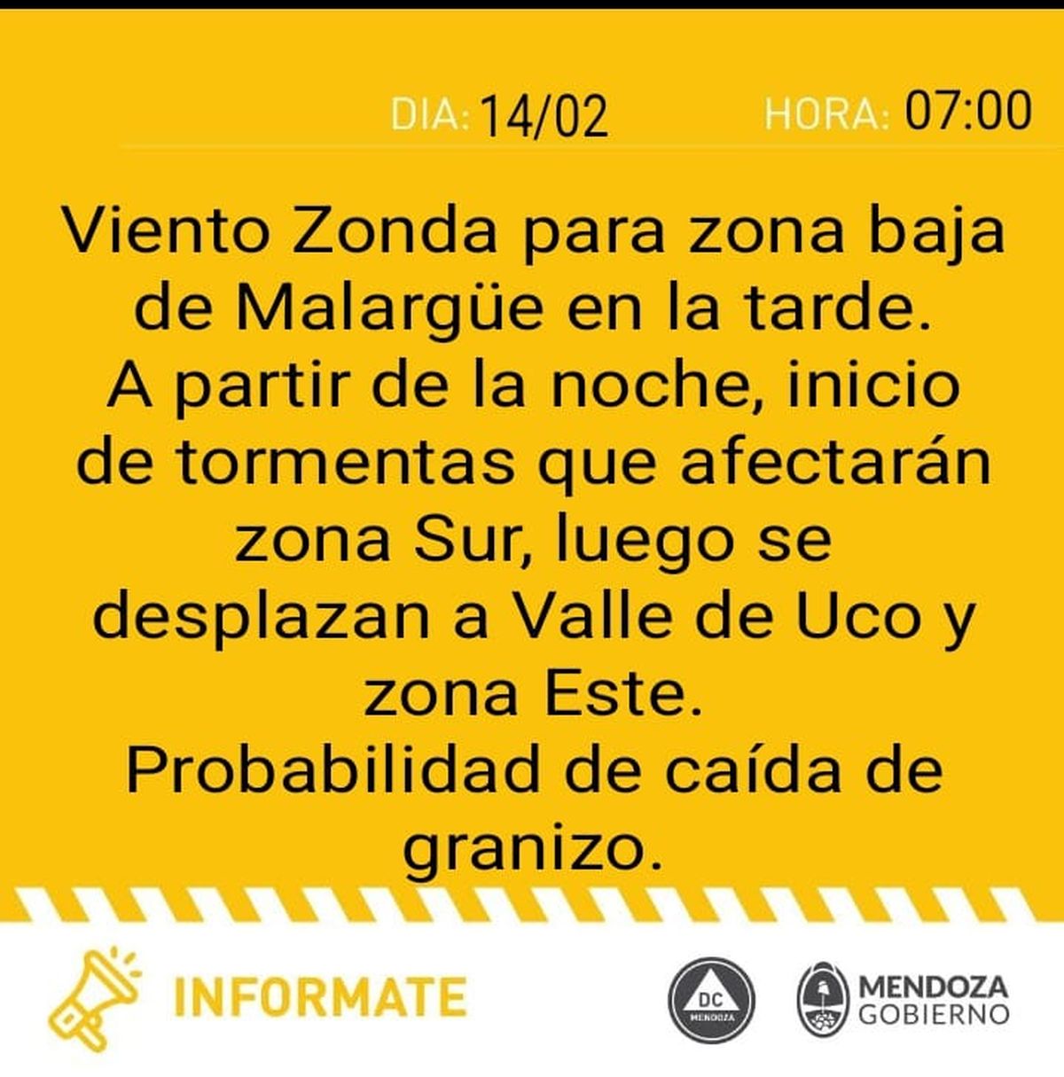 La alerta del SMN para este sábado abarca la zona baja de Malargüe por el Zonda. Las tormentas afectarán el Sur y luego se desplazarán al Valle de Uco y el Este