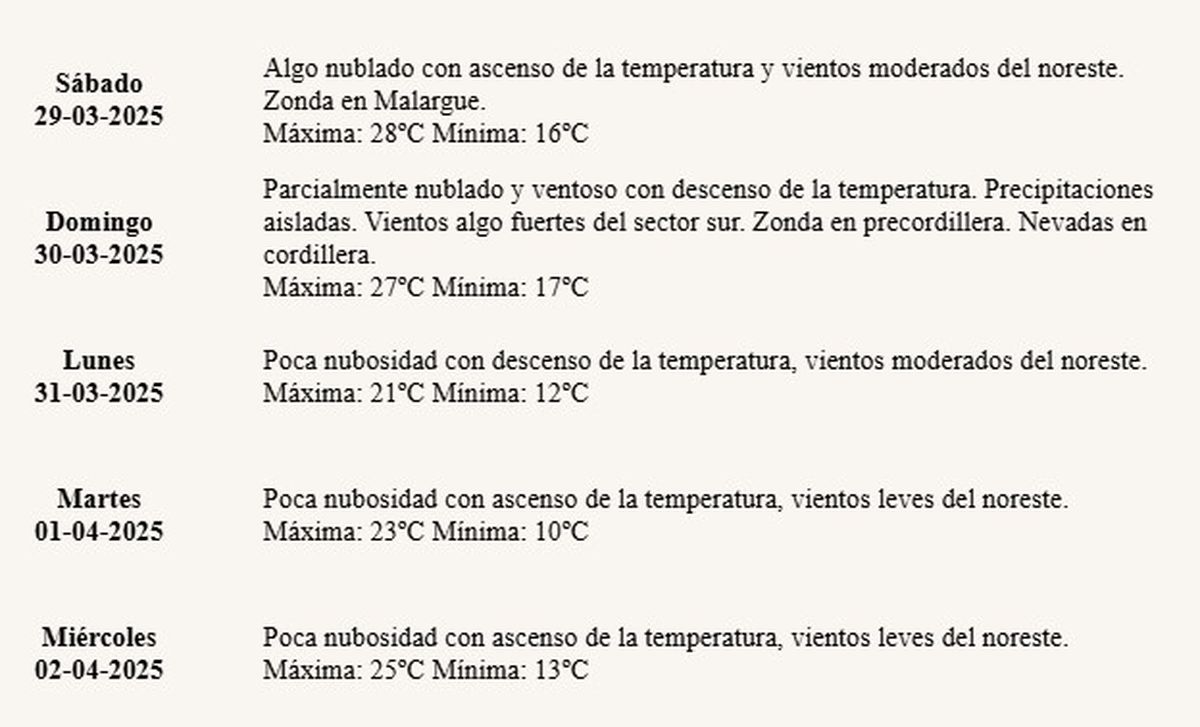 Según el pronóstico del tiempo emitido por el Servicio Meteorológico Nacional, Mendoza tendrá un fin de semana sin sol, con humedad y algunas lluvias. Mientras que en el sur de Malargüe rige una alerta por viento Zonda. En tanto que este domingo hay posibilidades de nieve en la cordillera y de Zonda en la precordillera de Mendoza.
