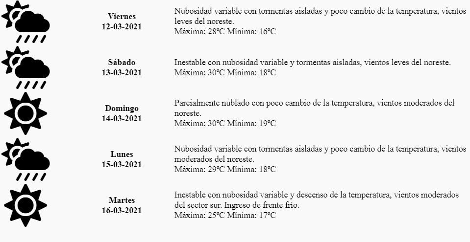 El pronóstico suministrado por la Dirección de Contingencias Climáticas, indica que para este viernes, "nubosidad variable con tormentas aisladas y poco cambio de la temperatura, vientos leves del noreste. Máxima 28º y mínima 16º