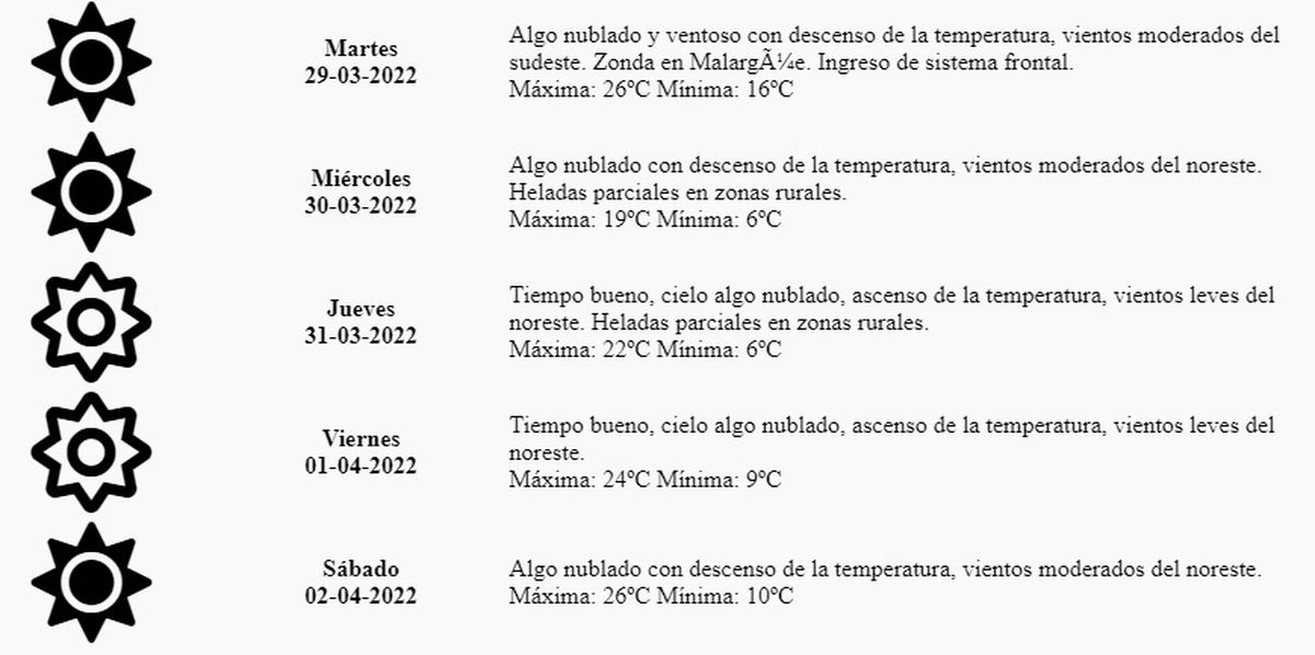 Para el jueves, el pronóstico indica "tiempo bueno, cielo algo nublado, ascenso de la temperatura, vientos leves del noreste. Heladas parciales en zonas rurales". Máxima 22º y mínima 6º.