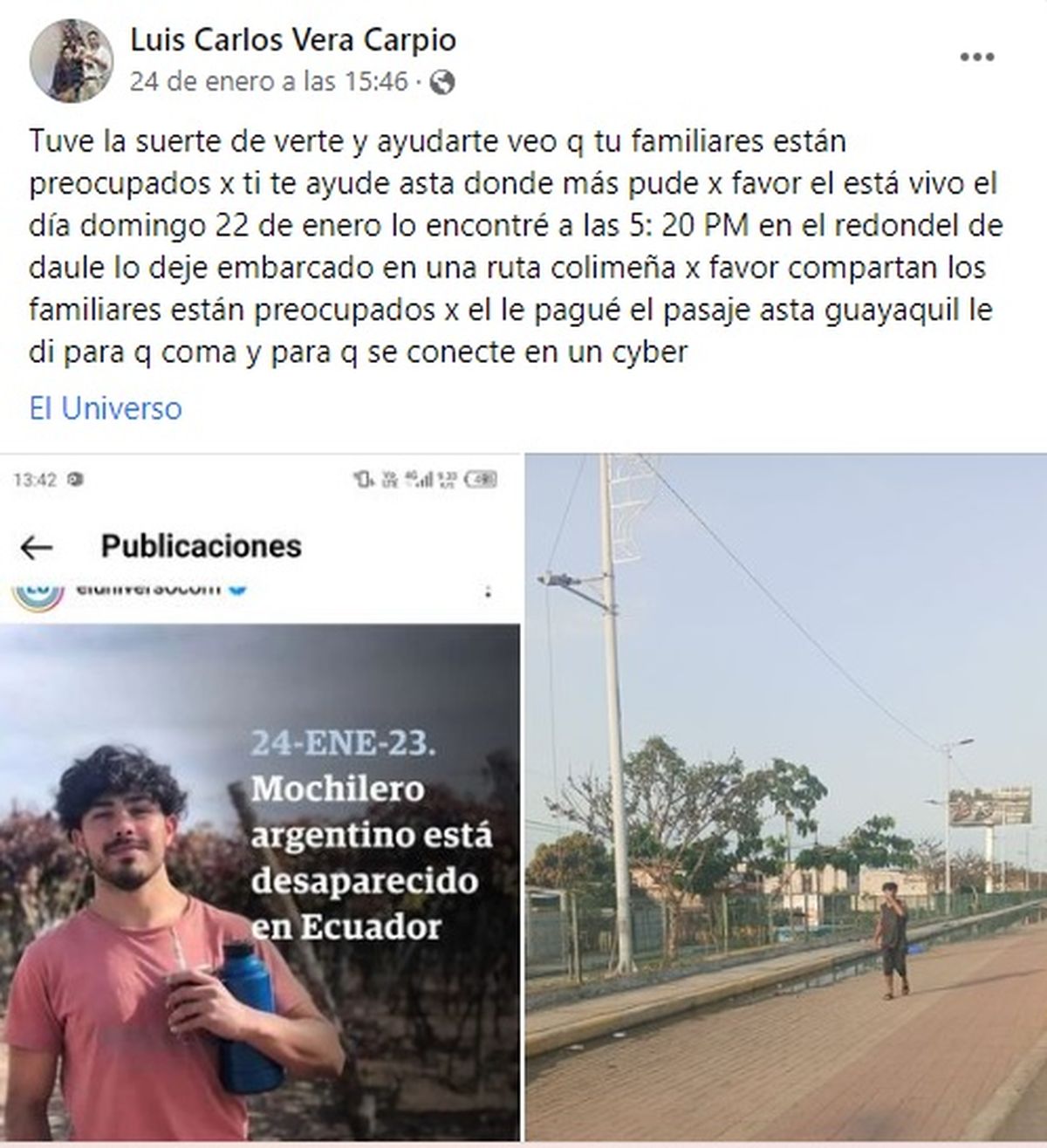 "Tuve la suerte de verte y ayudarte veo que tus familiares están preocupados por ti, te ayudé hasta donde más pude, por favor él está vivo, el día domingo 22 de enero lo encontré a las 5.20 PM en el redondel de daule, lo dejé embarcado en una ruta colimeña, por favor compartan, los familiares están preocupados por él, le pagué el pasaje hasta Guayaquil, le di para que coma y para que se conecte en un cyber", compartió el hombre con una foto de Rodrigo Salguero, el joven de Mendoza que estaba desaparecido en Ecuador.