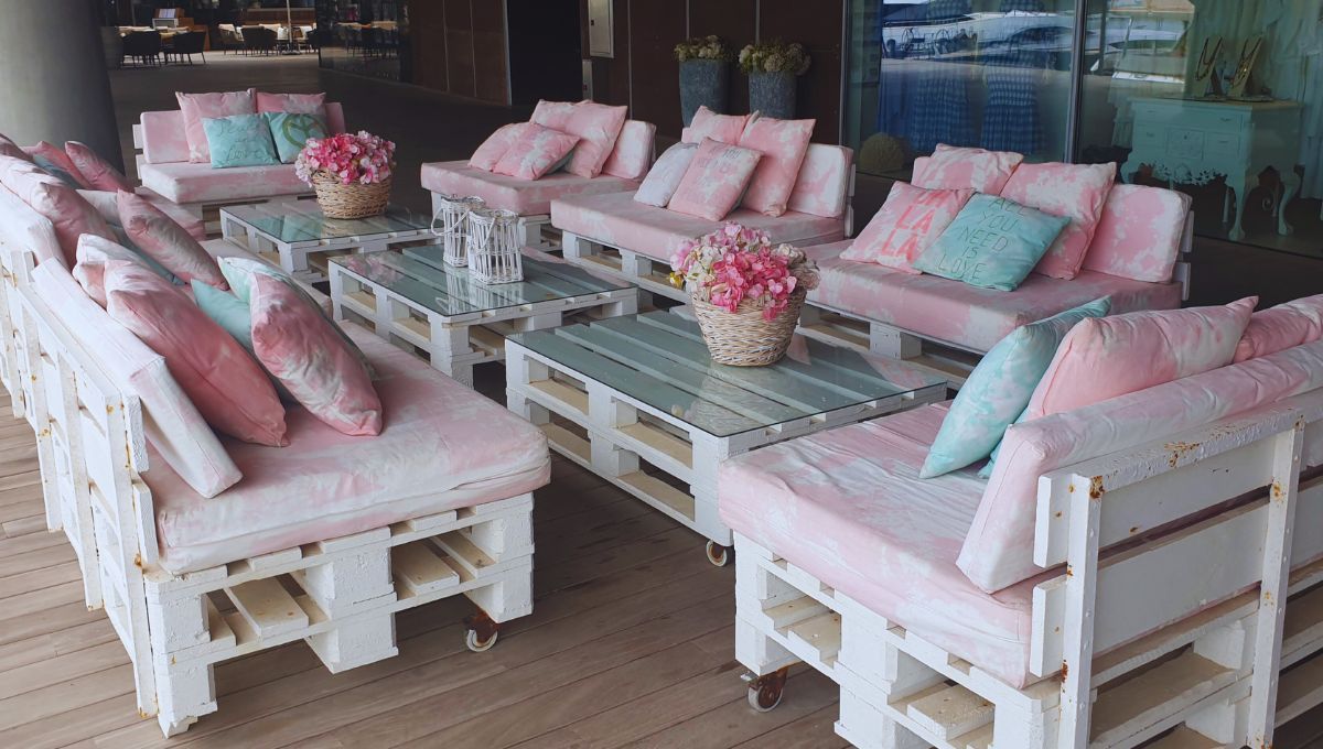 Sofás o sillones para exteriores: Se colocan dos o tres palets apilados como base y respaldo, se lijan y barnizan, y se les añaden cojines grandes. El resultado es un sofá rústico ideal para patios o balcones.
