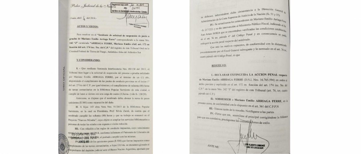 Arriaga Ferré finalmente obtuvo la probation -es decir, le suspendieron el juicio a prueba- y el Tribunal Oral en lo Criminal de Tierra del Fuego le extinguió la pena luego de cumplir un año de tareas comunitarias y del pago de una multa.