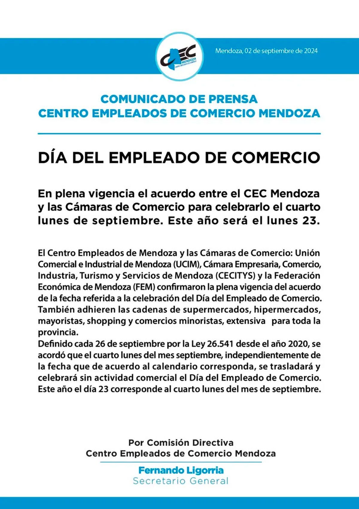 El próximo lunes 23 de septiembre los empleados de comercio van a tener feriado en Mendoza tras el acuerdo que llevó adelante el Centro Empleados de Comercio (CEC) Mendoza y las Cámaras de Comercio, por la celebración del "Día del Empleado de Comercio".
