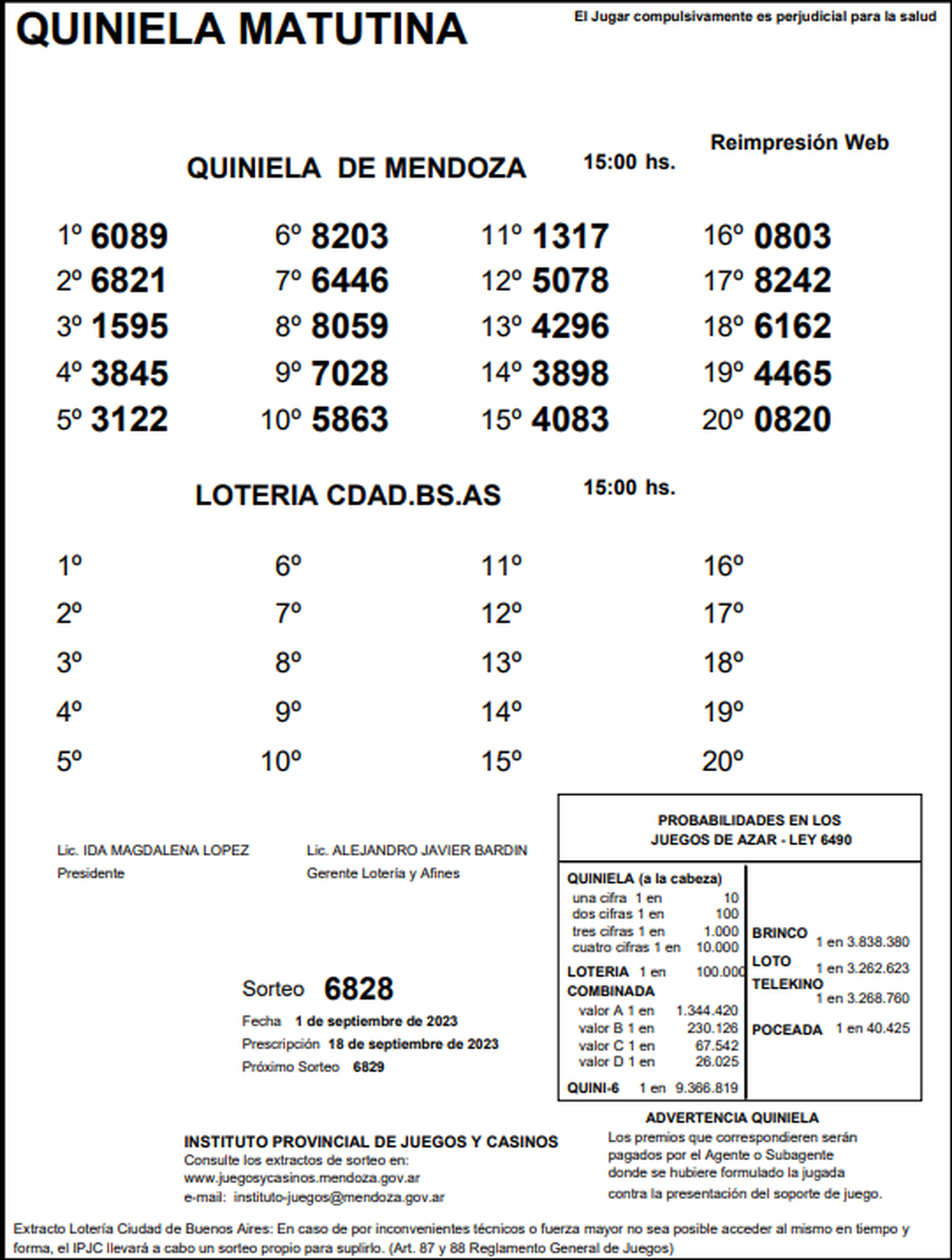 Este 1 de septiembre de agosto se llevó a cabo el sorteo número 6828 de la Quiniela de Mendoza en su edición la Matutina y el número ganador resultó ser el 6089. Mientras que en el segundo lugar salió el 6821 y en el tercer lugar el 1595.