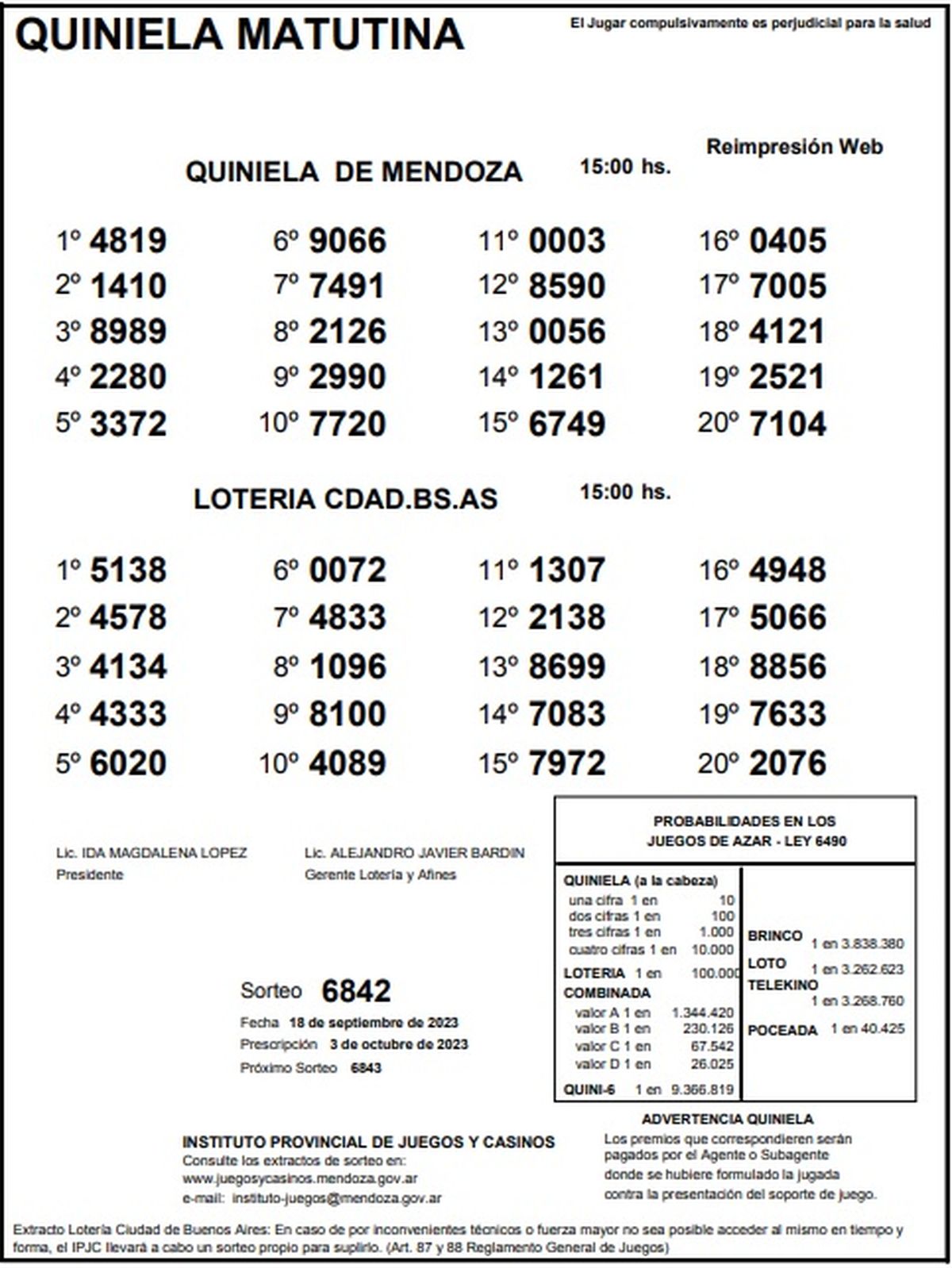 ►TE PUEDE INTERESAR: Resultados de la Quiniela de Mendoza: La Primera 18 de septiembre