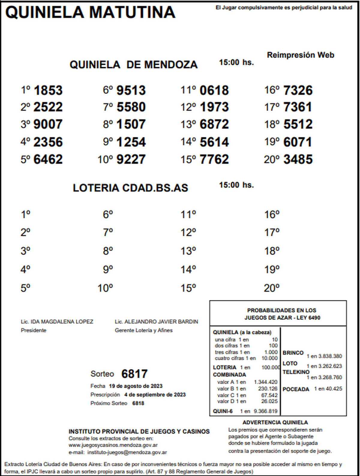 Quiniela de Mendoza: resultados de la Matutina de hoy, 19 de agosto de 2023