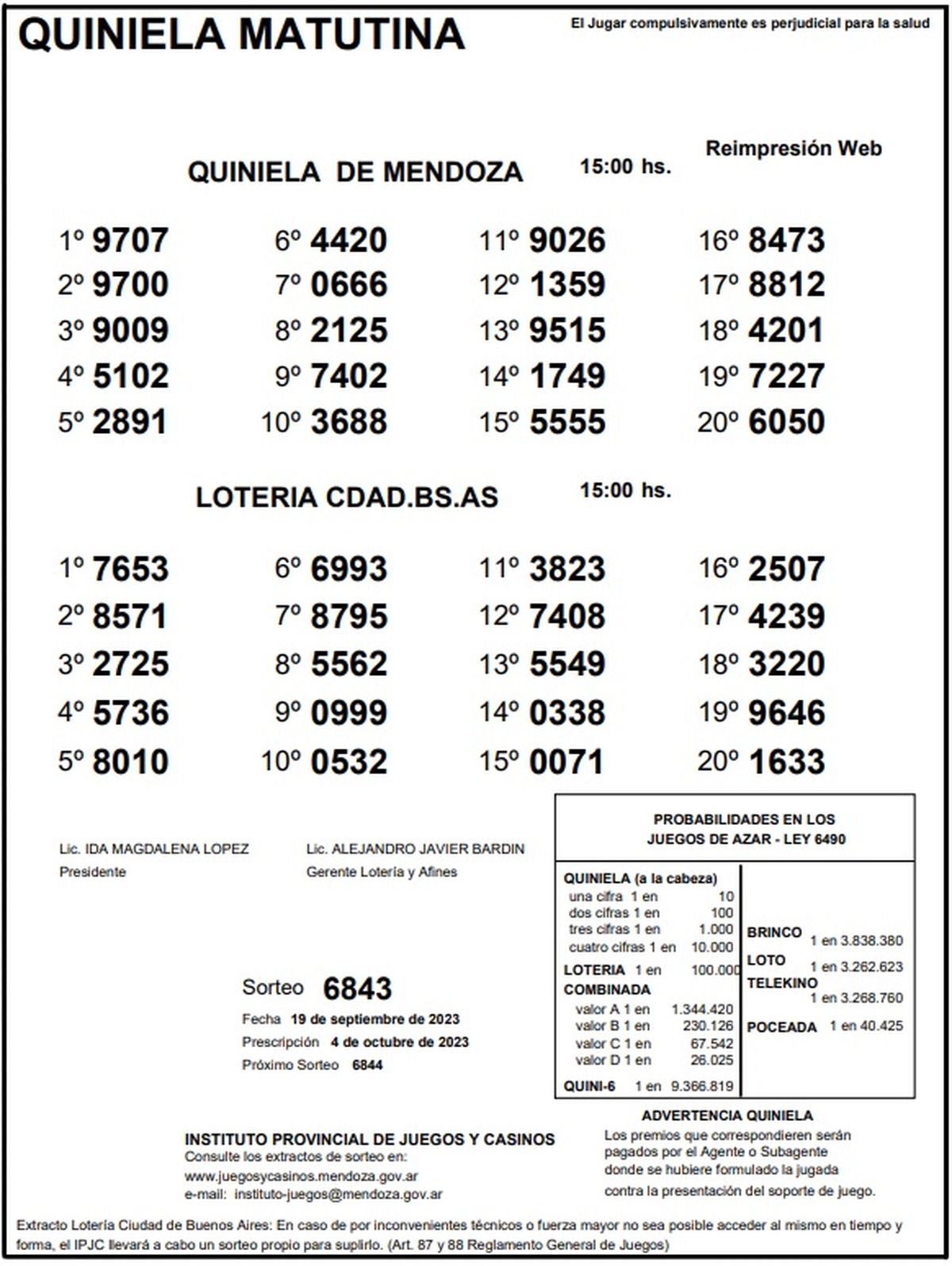 Quiniela de Mendoza: resultados de la Matutina de hoy, 19 de septiembre de 2023