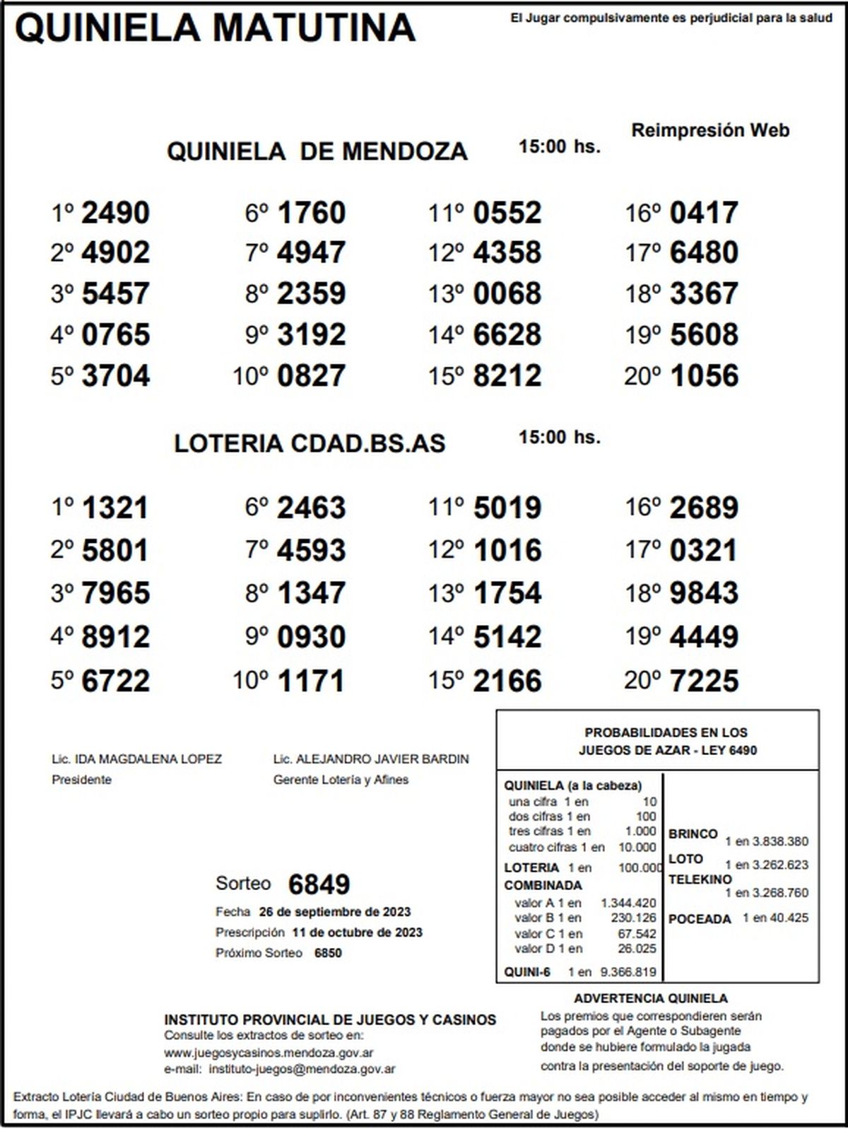 Este martes 25 septiembre se llevó a cabo el sorteo número 6849 de la Quiniela de Mendoza en su edición Matutina y el número ganador resultó ser el 2490. Mientras que en el segundo lugar salió el 4902 y en el tercer lugar el 5457.