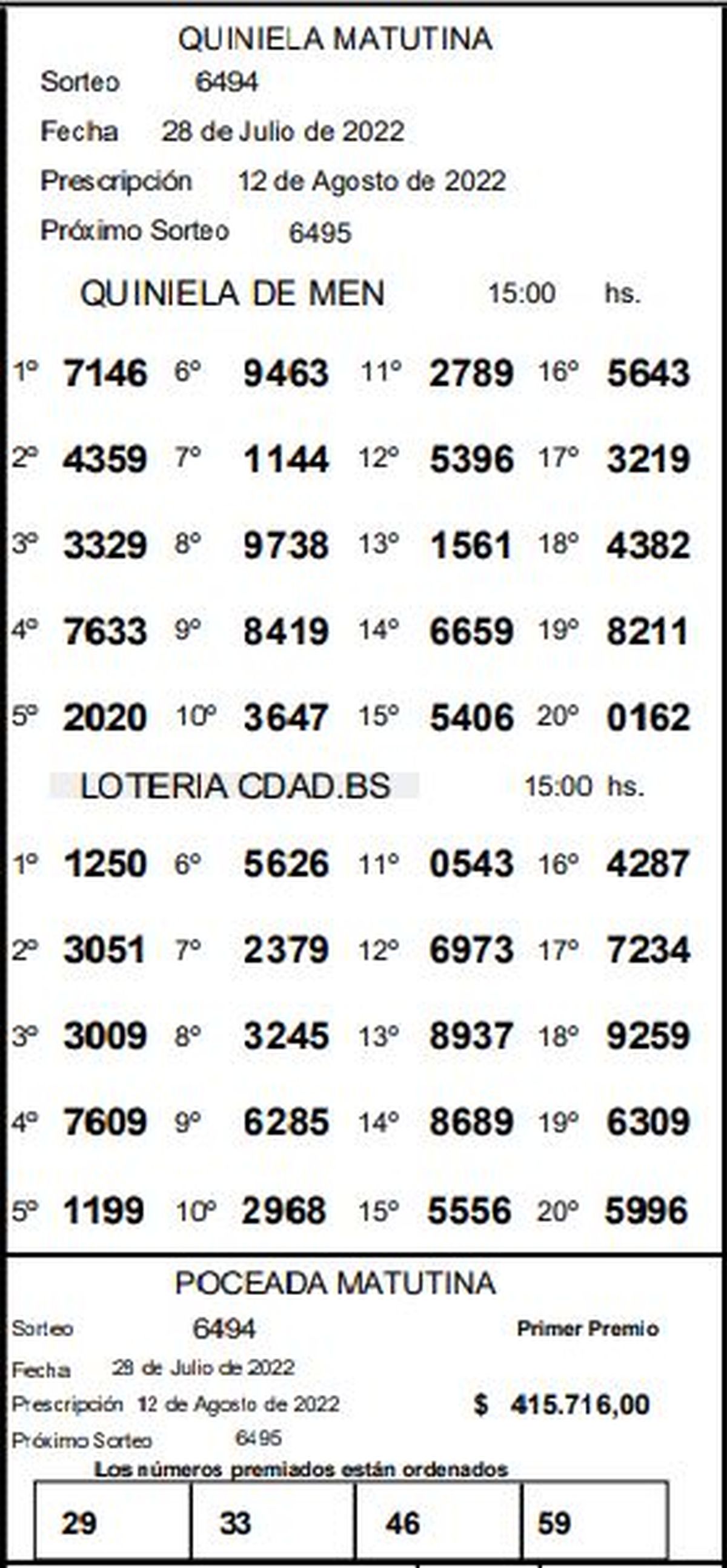 Este jueves 28 de julio se realizó el sorteo número 6494 de la Quiniela de Mendoza en su edición Matutina y el número ganador resultó ser el 7146. Mientras que en el segundo lugar salió el 4359 y en el tercer lugar el 3329.