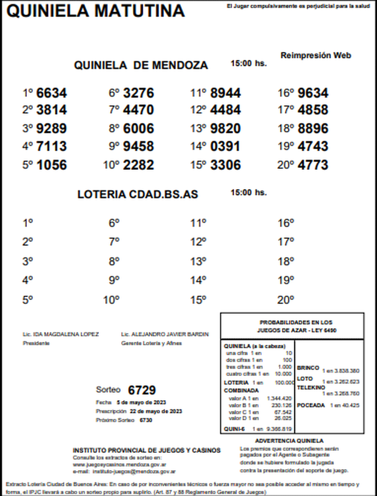 Este viernes 5 de mayo se realizó el sorteo número 6729 de la Quiniela de Mendoza en su edición Matutina y el número ganador resultó ser el 6634. Mientras que en el segundo lugar salió el 3814 y en el tercer lugar el 9289.
