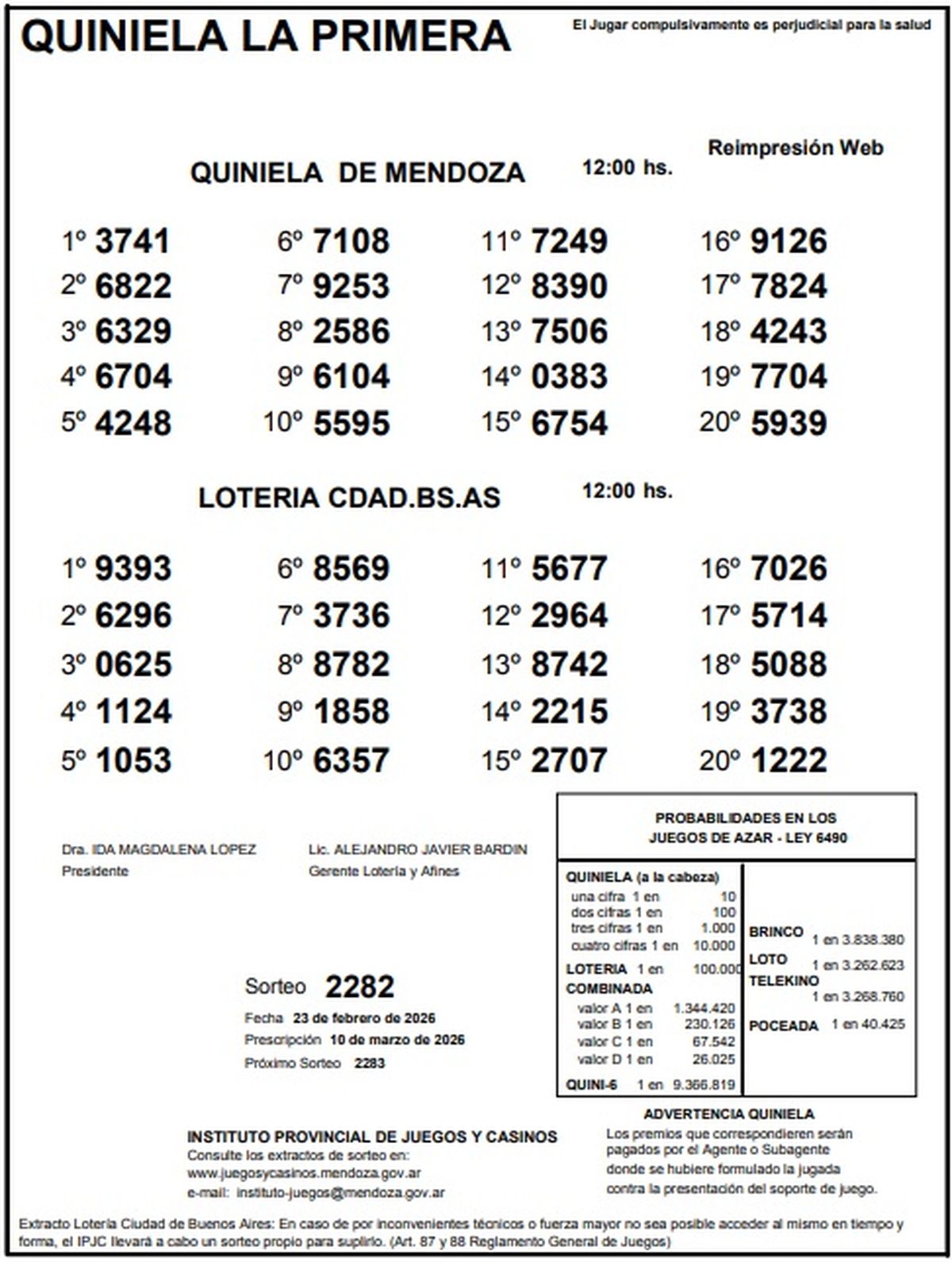 Resultados Quiniela de Mendoza: La Primera del 23 de febrero de 2026