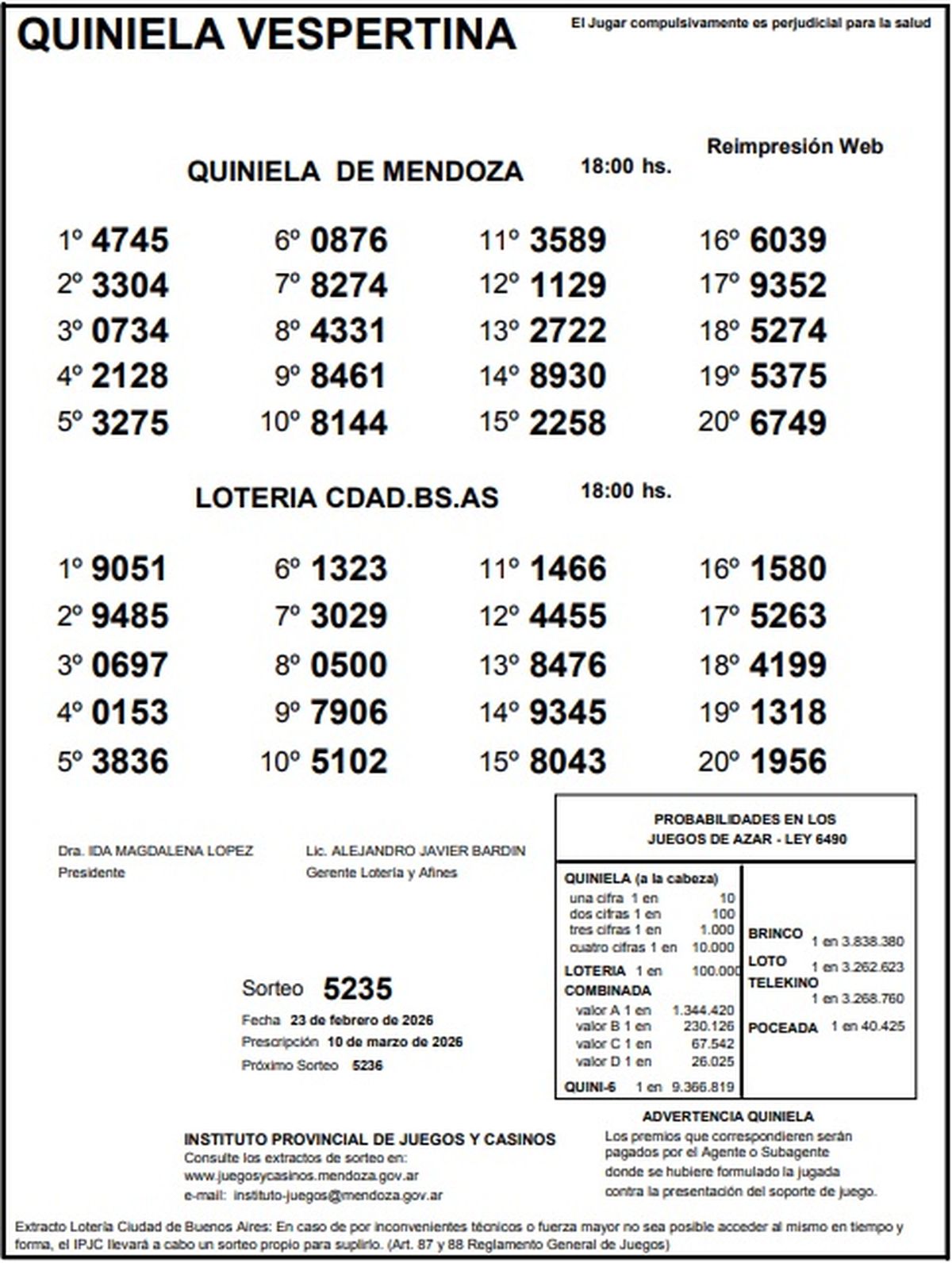 Resultados Quiniela de Mendoza: La Vespertina del 23 de febrero de 2026