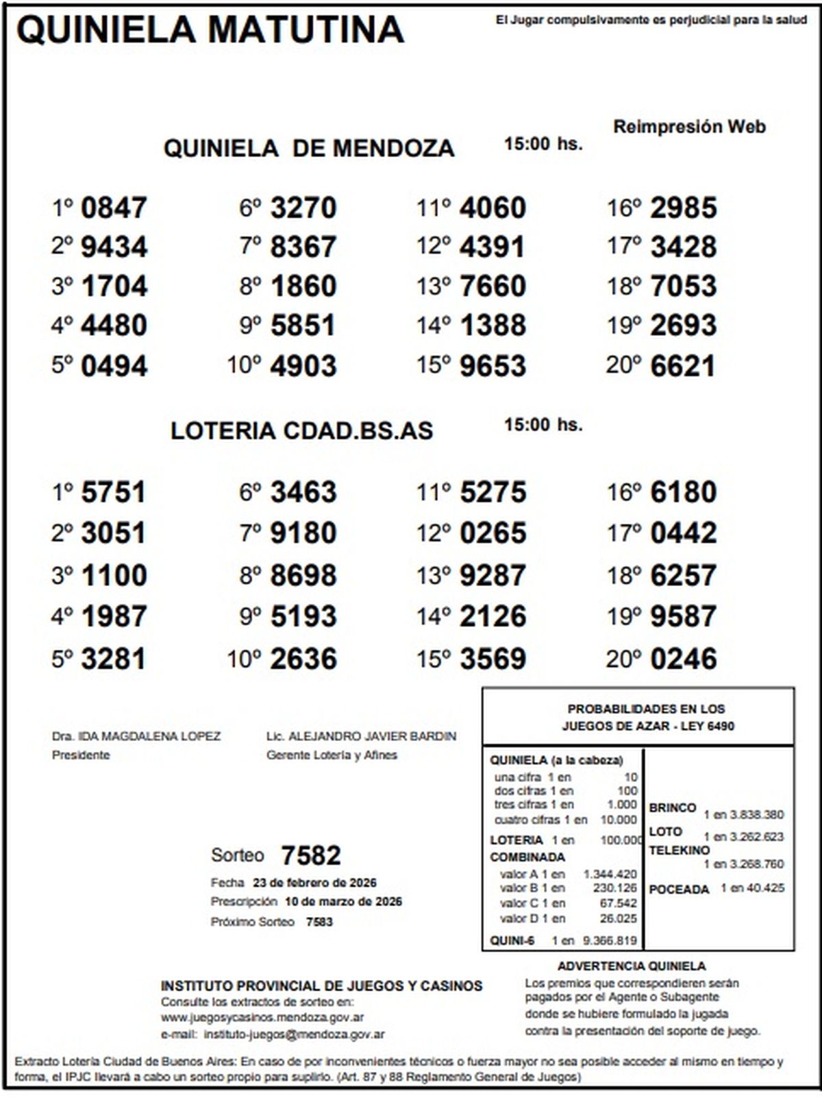 Resultados Quiniela de Mendoza: La Matutina del 23 de febrero de 2026