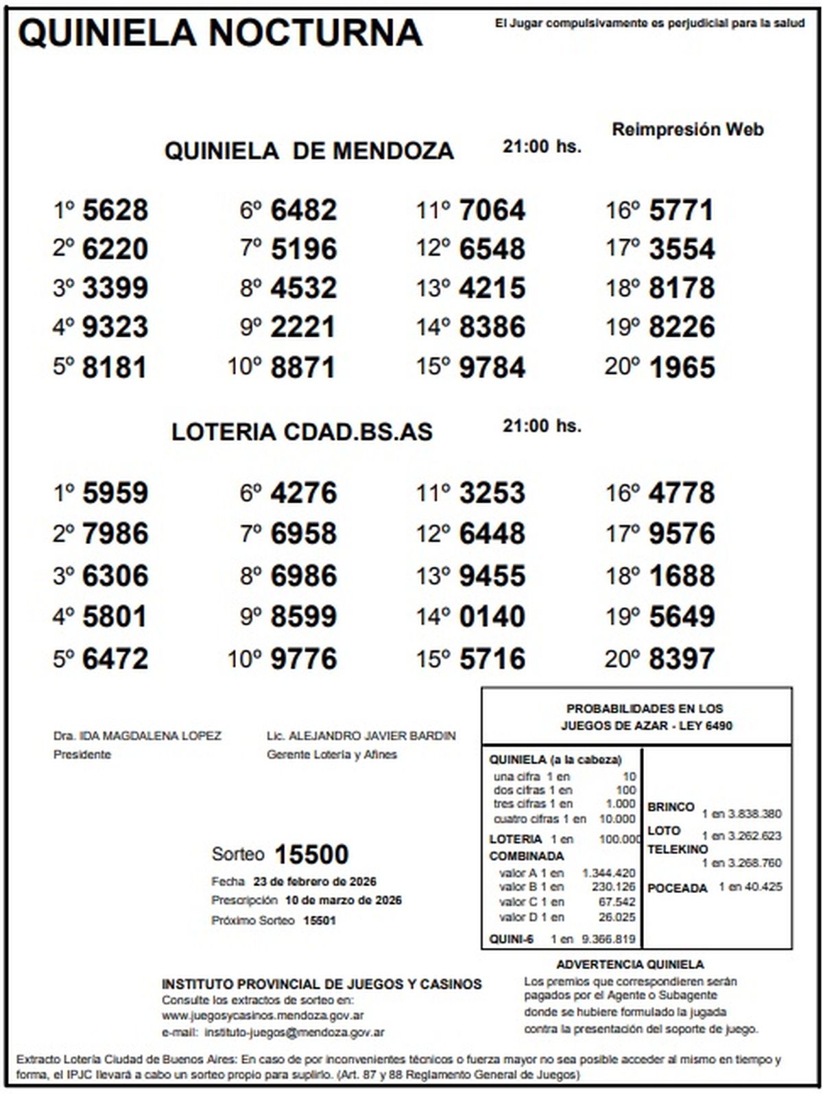 Quiniela de Mendoza: resultados de la Nocturna de este hoy, 23 de febrero de 2026