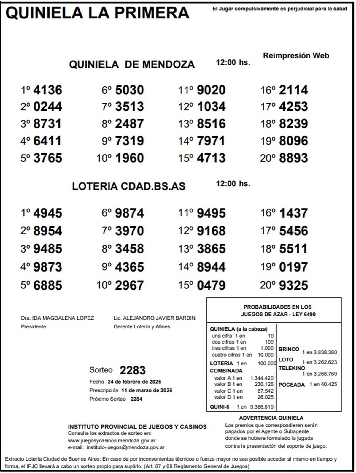 Resultados Quiniela de Mendoza: La Primera del 24 de febrero de 2026