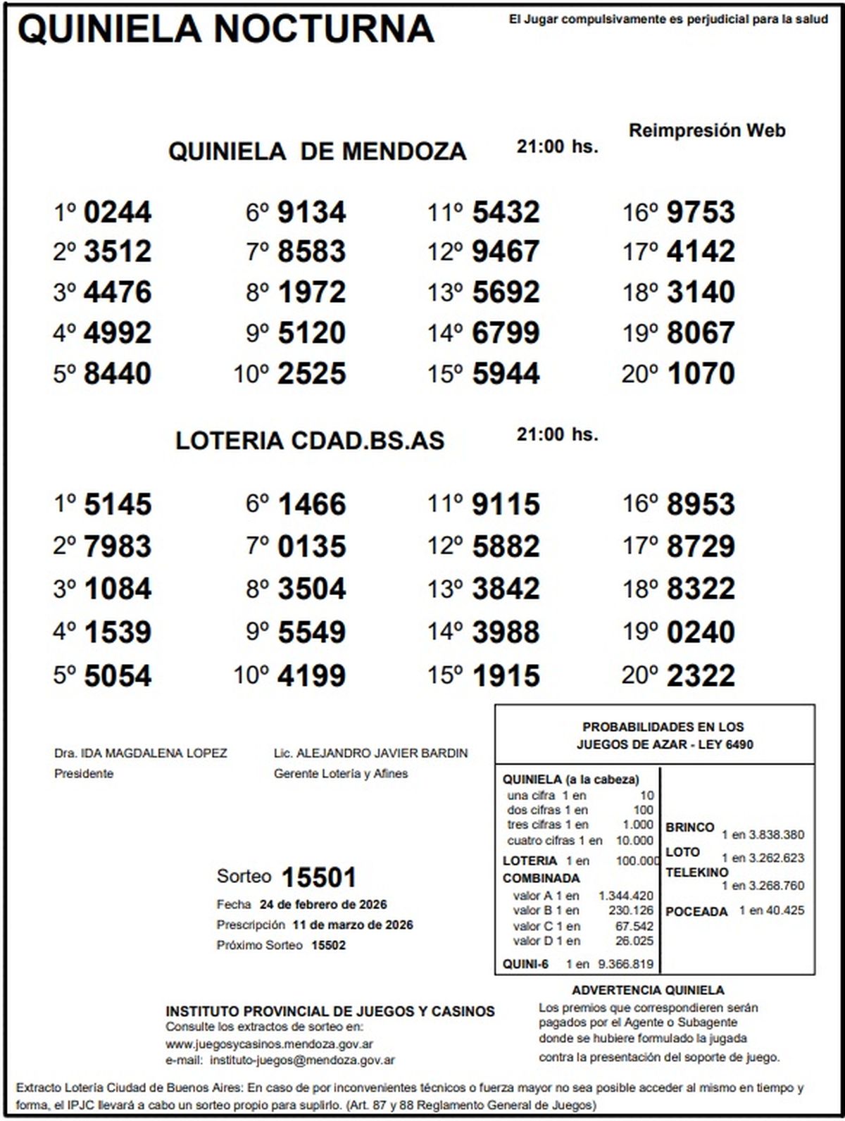 Quiniela de Mendoza: resultados de la Nocturna de este hoy, 24 de febrero de 2026