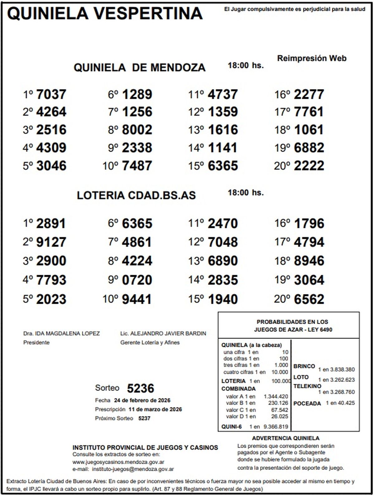Resultados Quiniela de Mendoza: La Vespertina del 24 de febrero de 2026