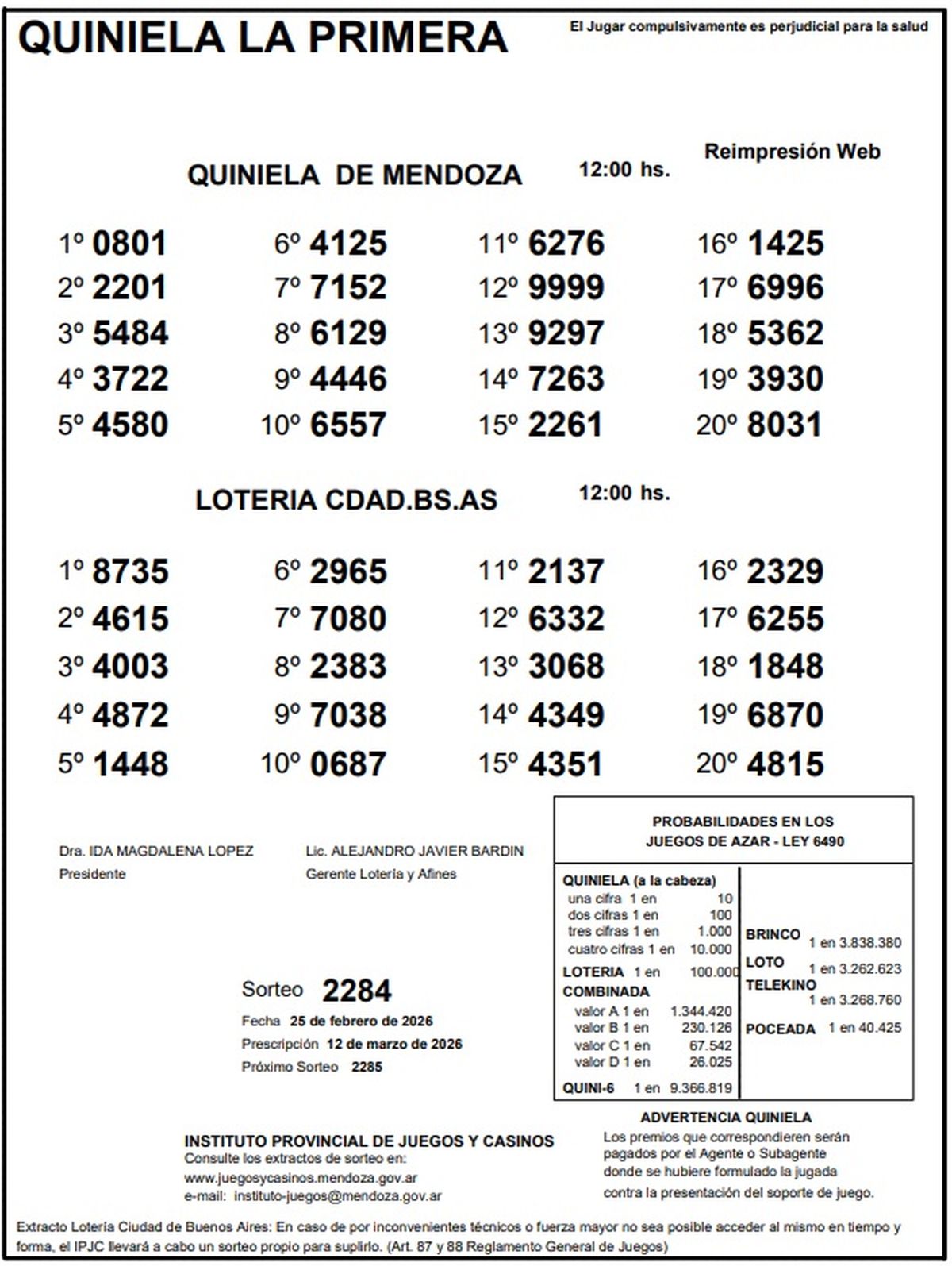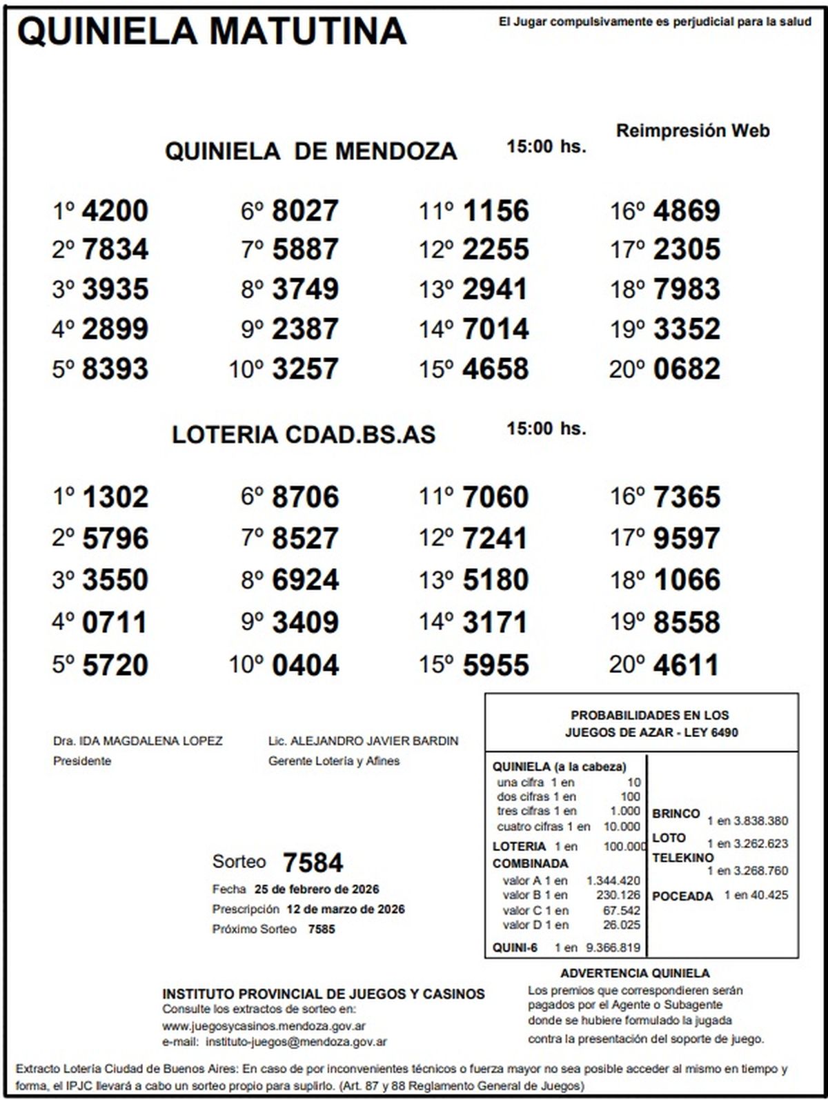 Resultados Quiniela de Mendoza: La Matutina del 25 de febrero de 2026