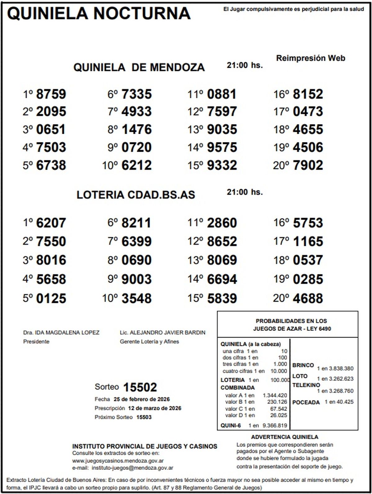 Quiniela de Mendoza: resultados de la Nocturna de este hoy, 25 de febrero de 2026