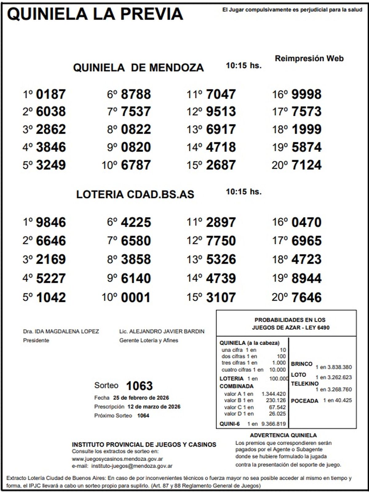 Resultados Quiniela de Mendoza: La Previa del 25 de febrero de 2026