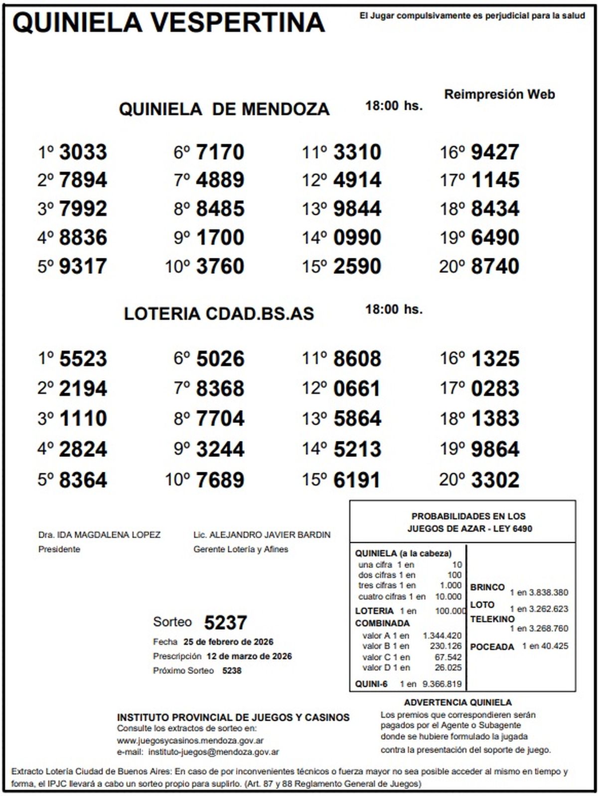 Resultados Quiniela de Mendoza: La Vespertina del 25 de febrero de 2026