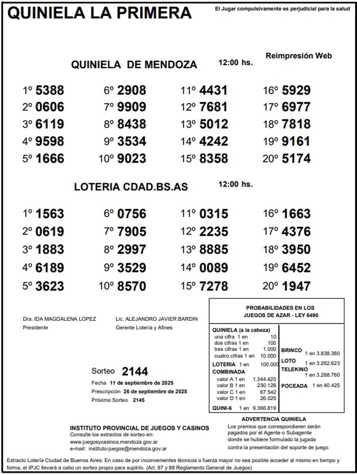 Resultados Quiniela de Mendoza: La Primera del 11 de septiembre de 2025