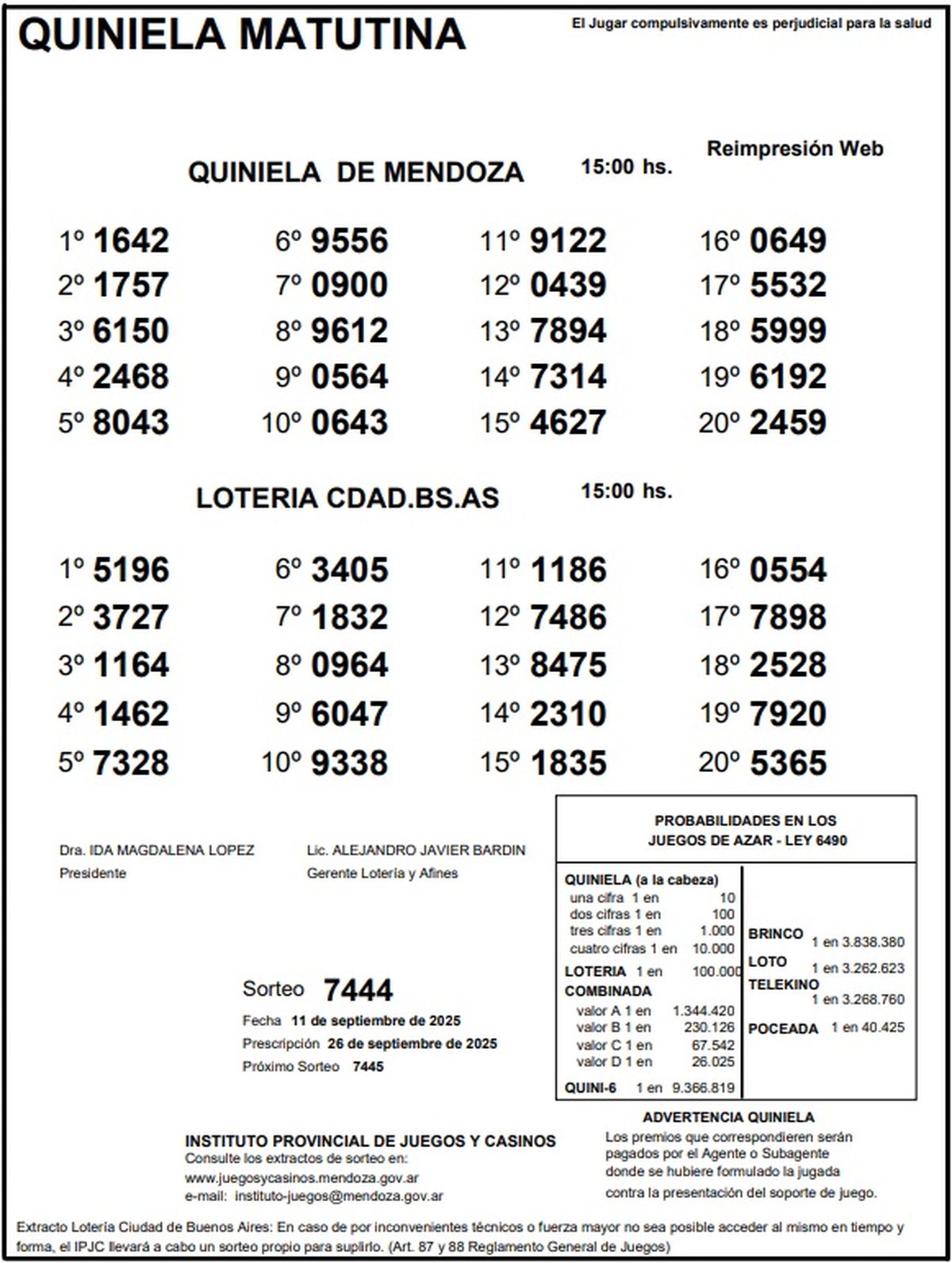 Resultados Quiniela de Mendoza: La Matutina del 11 de septiembre de 2025