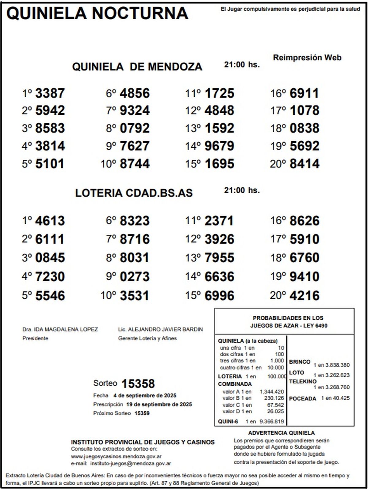 Quiniela de Mendoza: resultados de la Nocturna de este jueves 4 de septiembre de 2025