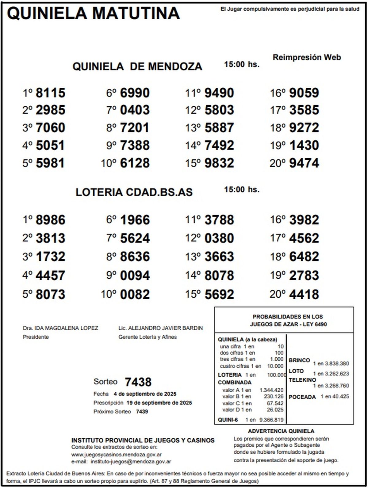 Resultados Quiniela de Mendoza: La Matutina del 4 de septiembre de 2025
