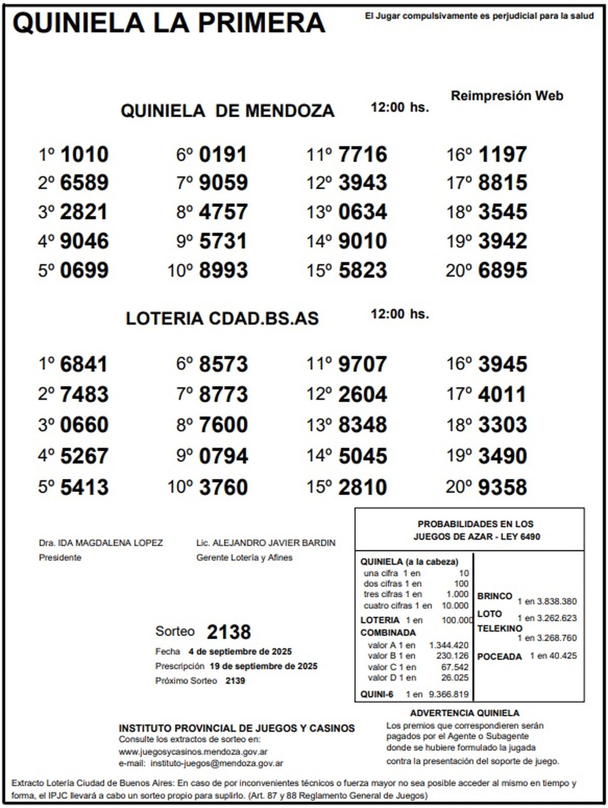 Resultados Quiniela de Mendoza: La Primera del 4 de septiembre de 2025