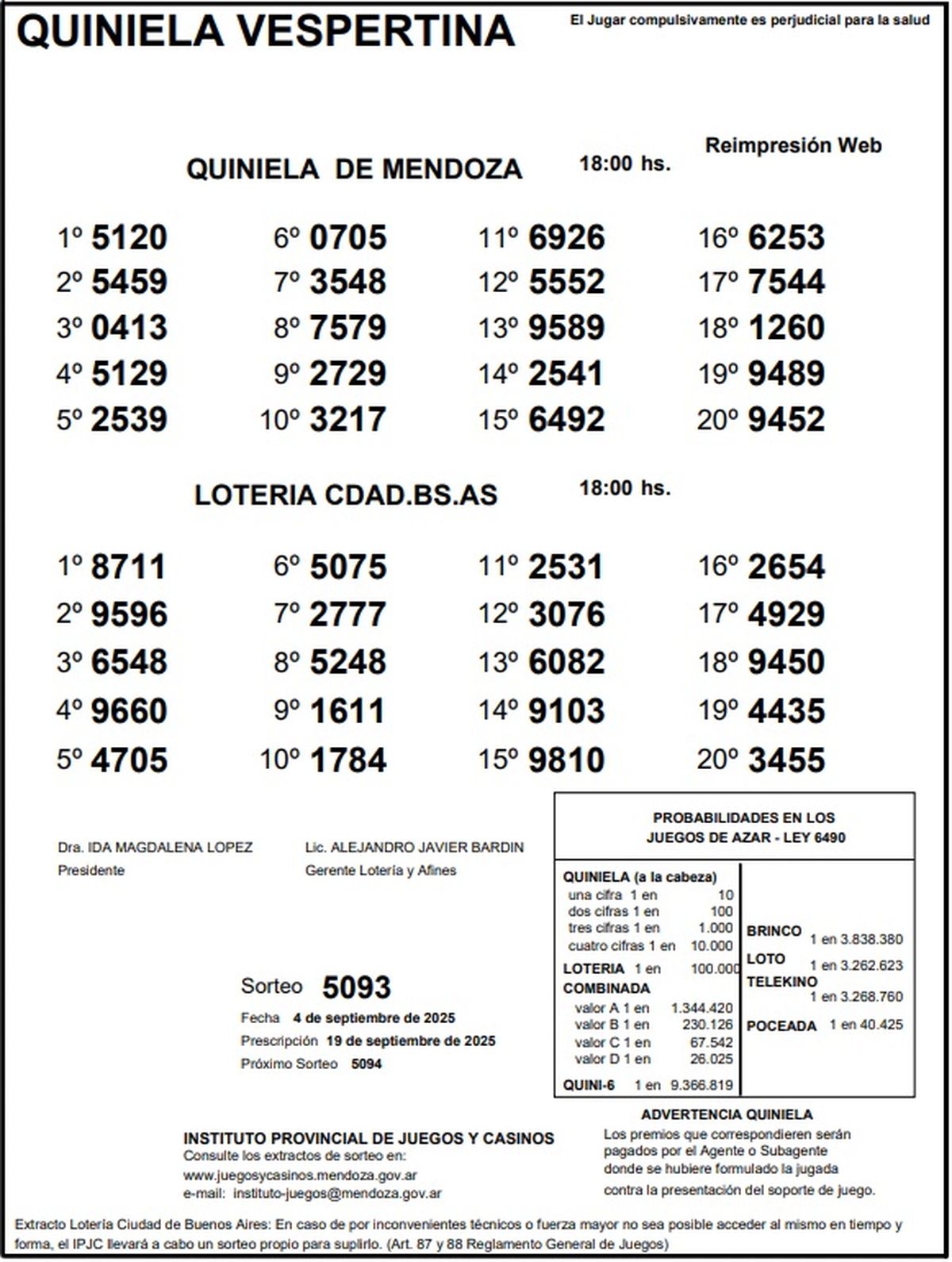 Resultados Quiniela de Mendoza: La Vespertina del 4 de septiembre de 2025