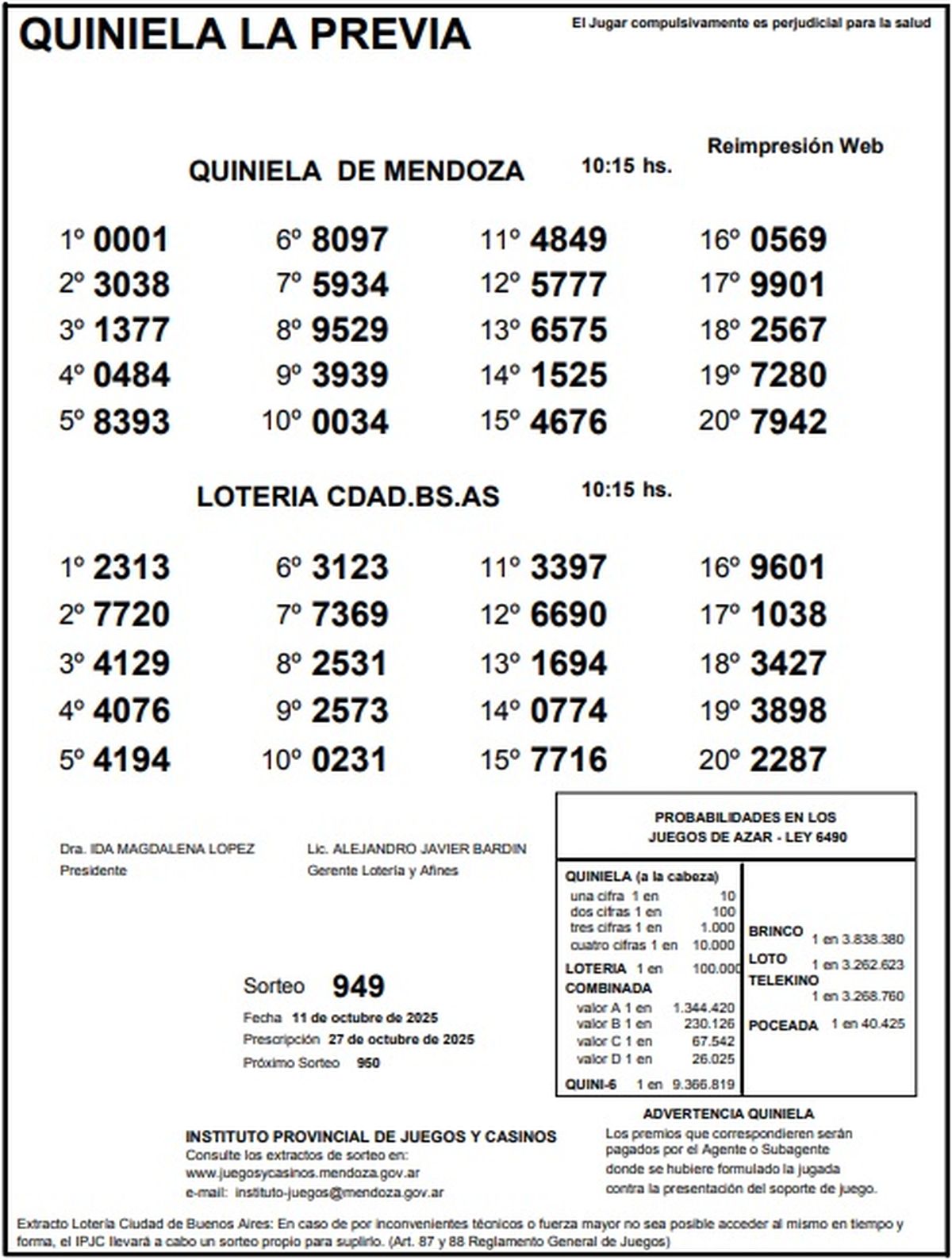 Resultados Quiniela de Mendoza: La Previa del 11 de octubre de 2025