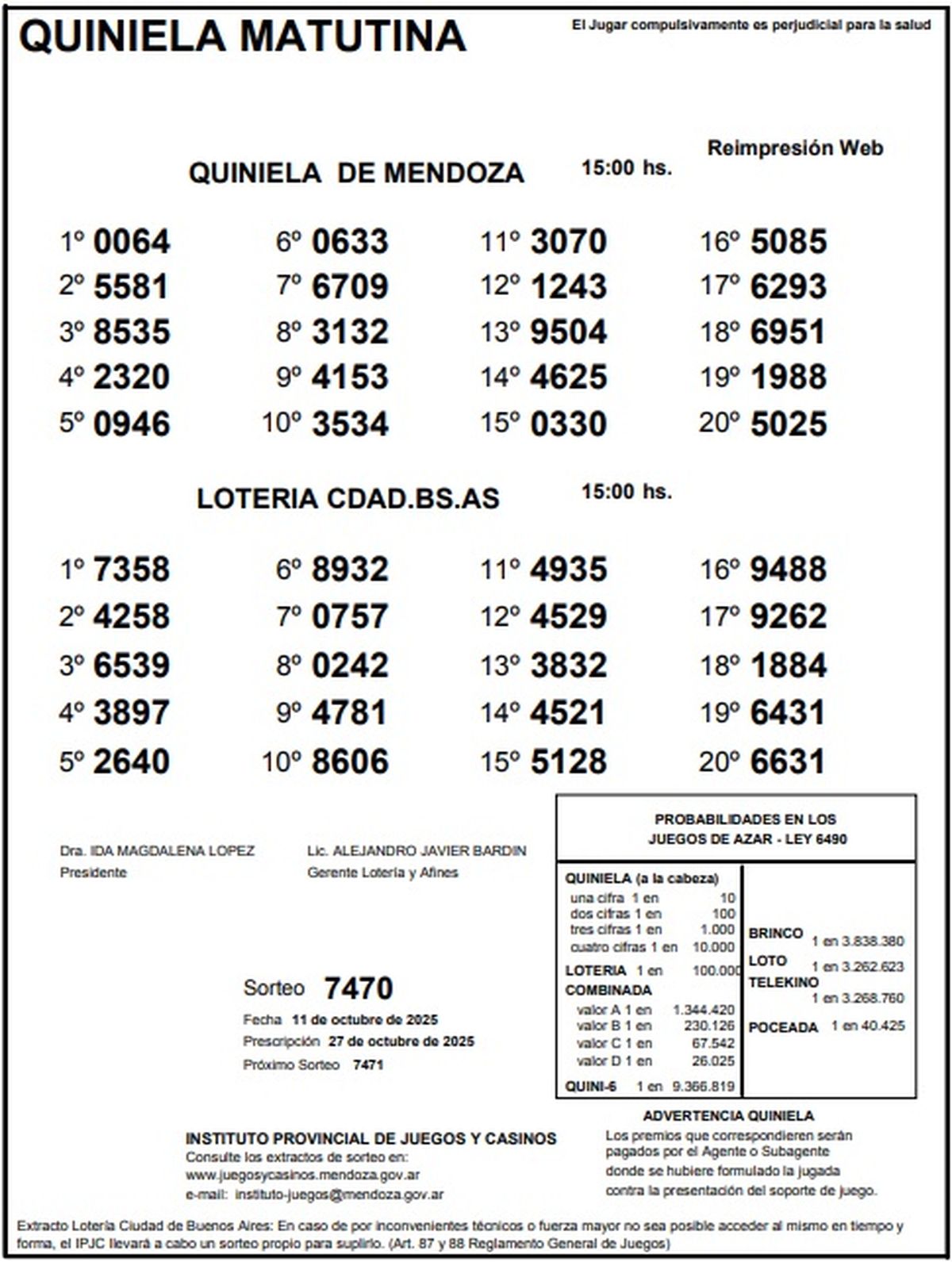 Resultados Quiniela de Mendoza: La Matutina del 11 de octubre de 2025