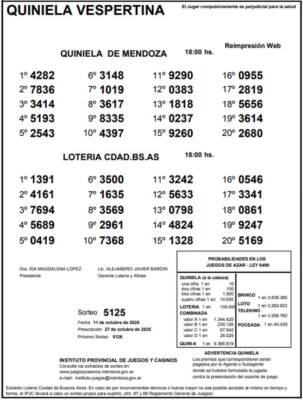 Resultados Quiniela de Mendoza: La Vespertina del 11 de octubre de 2025