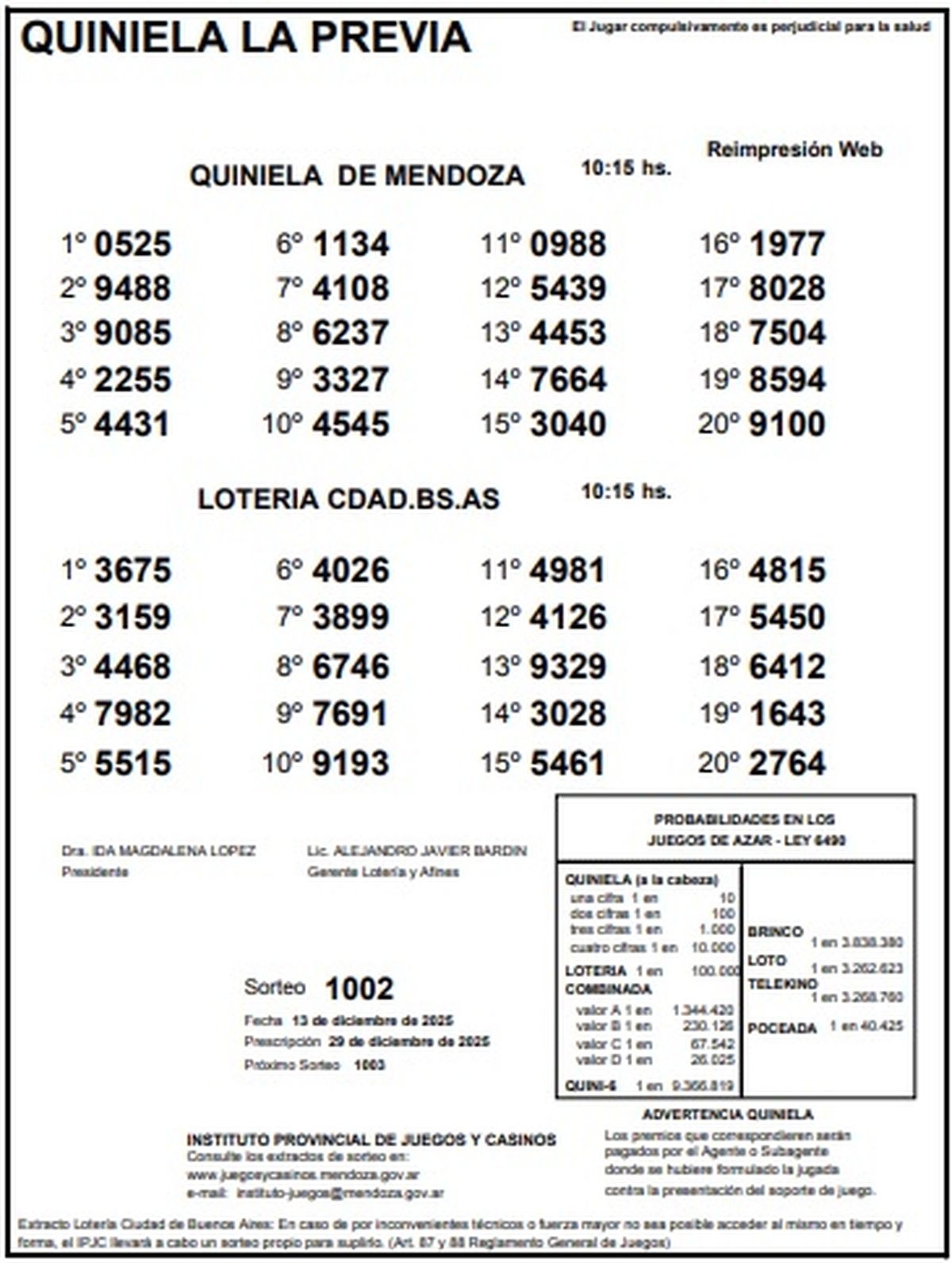 Resultados Quiniela de Mendoza: La Previa del 13 de diciembre de 2025