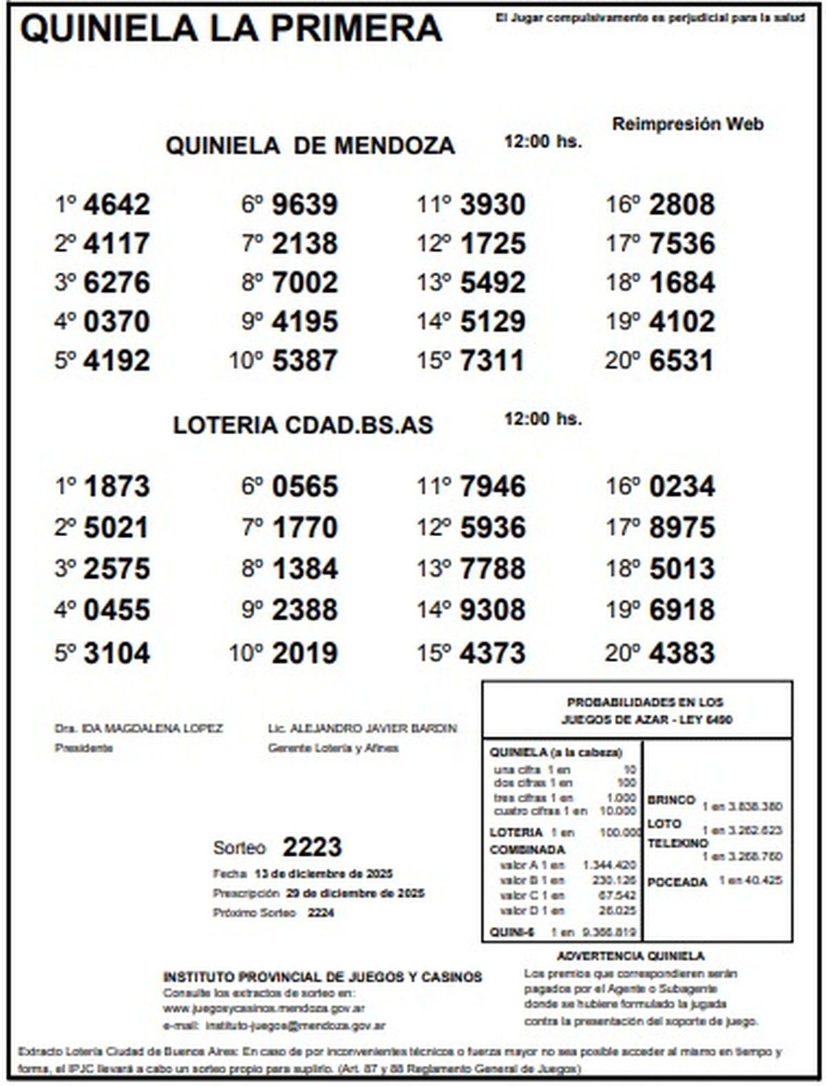 Resultados Quiniela de Mendoza: La Primera del 13 de diciembre de 2025