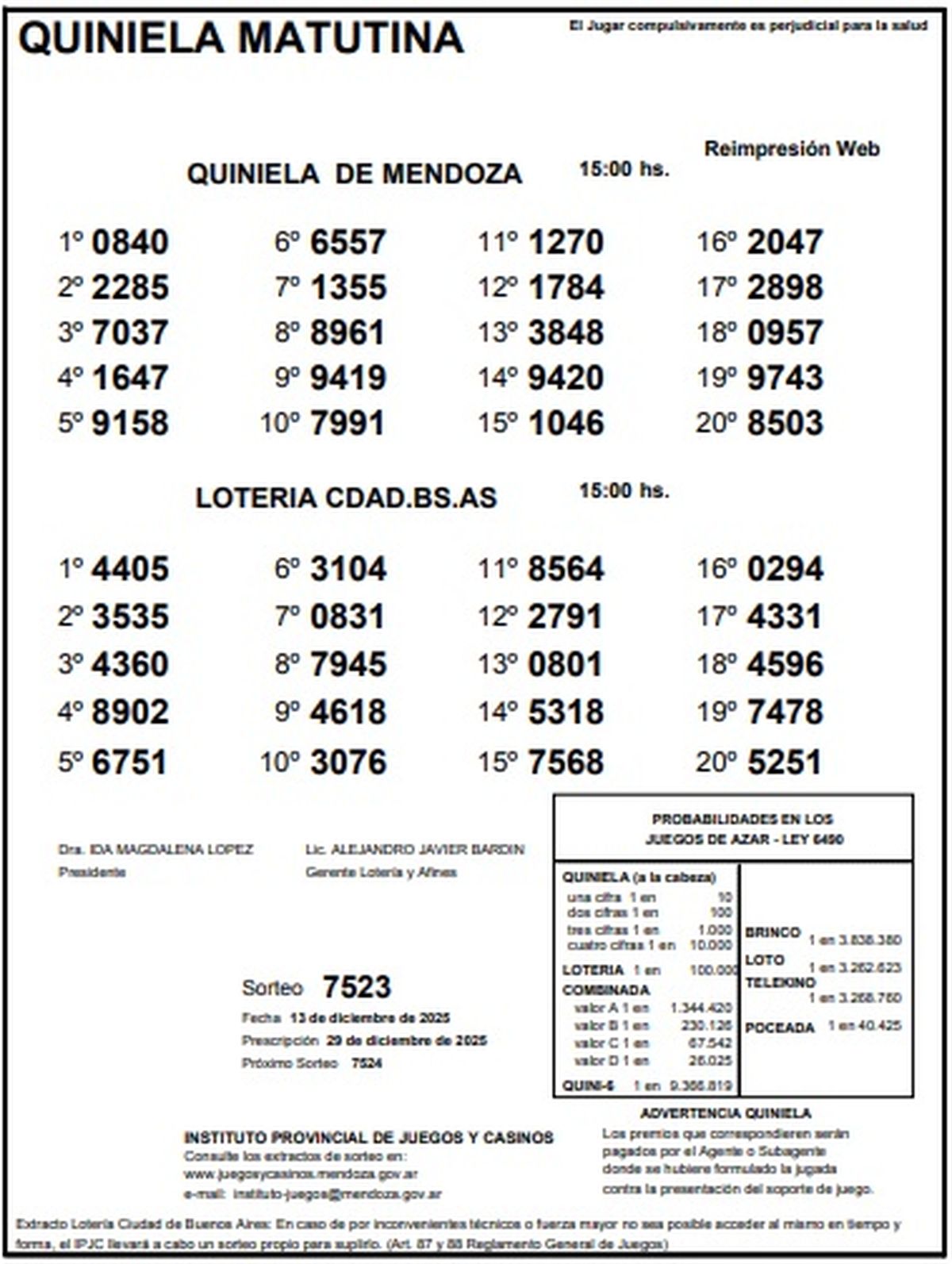 Resultados Quiniela de Mendoza: La Matutina del 13 de diciembre de 2025