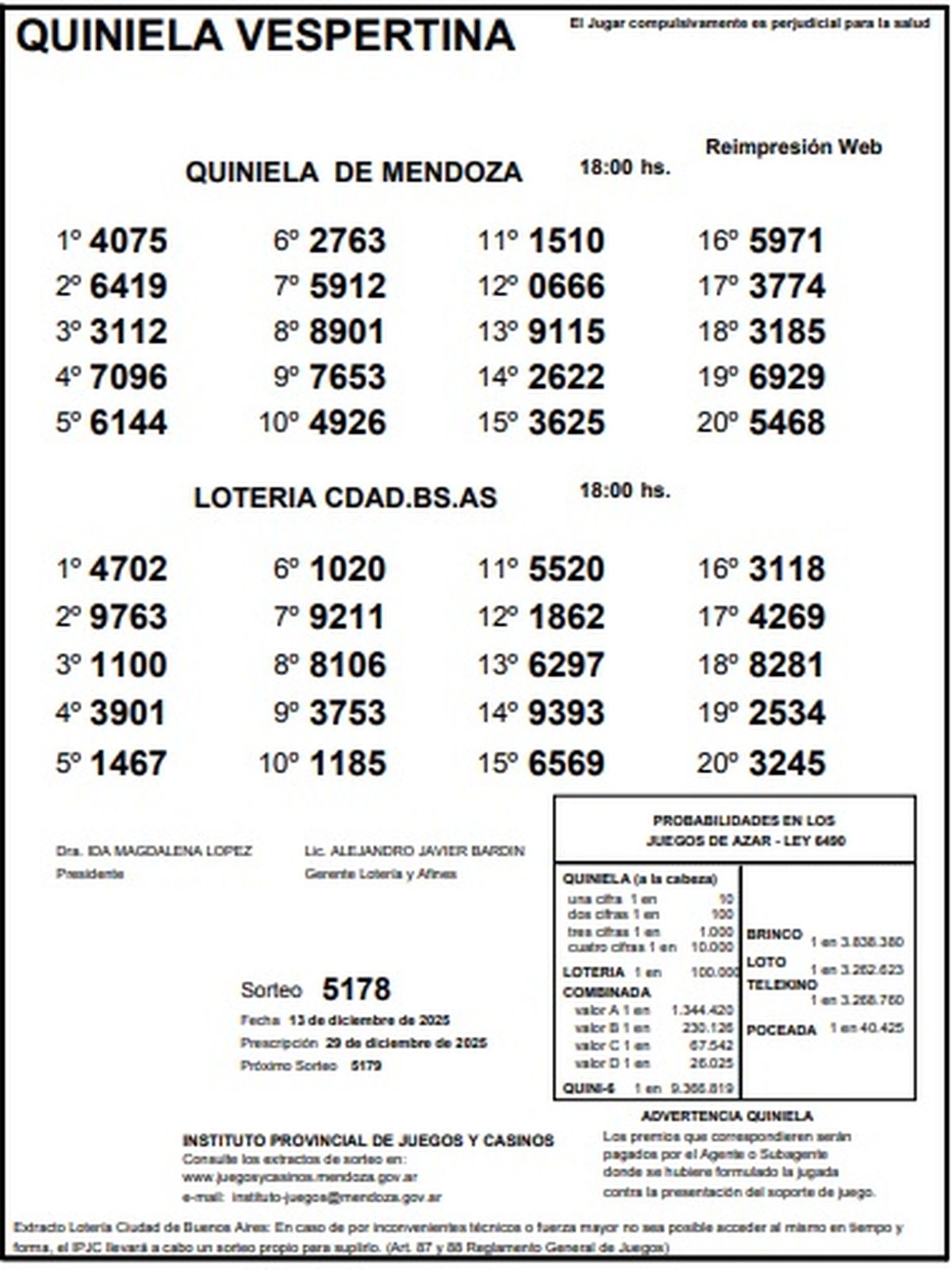 Resultados Quiniela de Mendoza: La Vespertina del 13 de diciembre de 2025