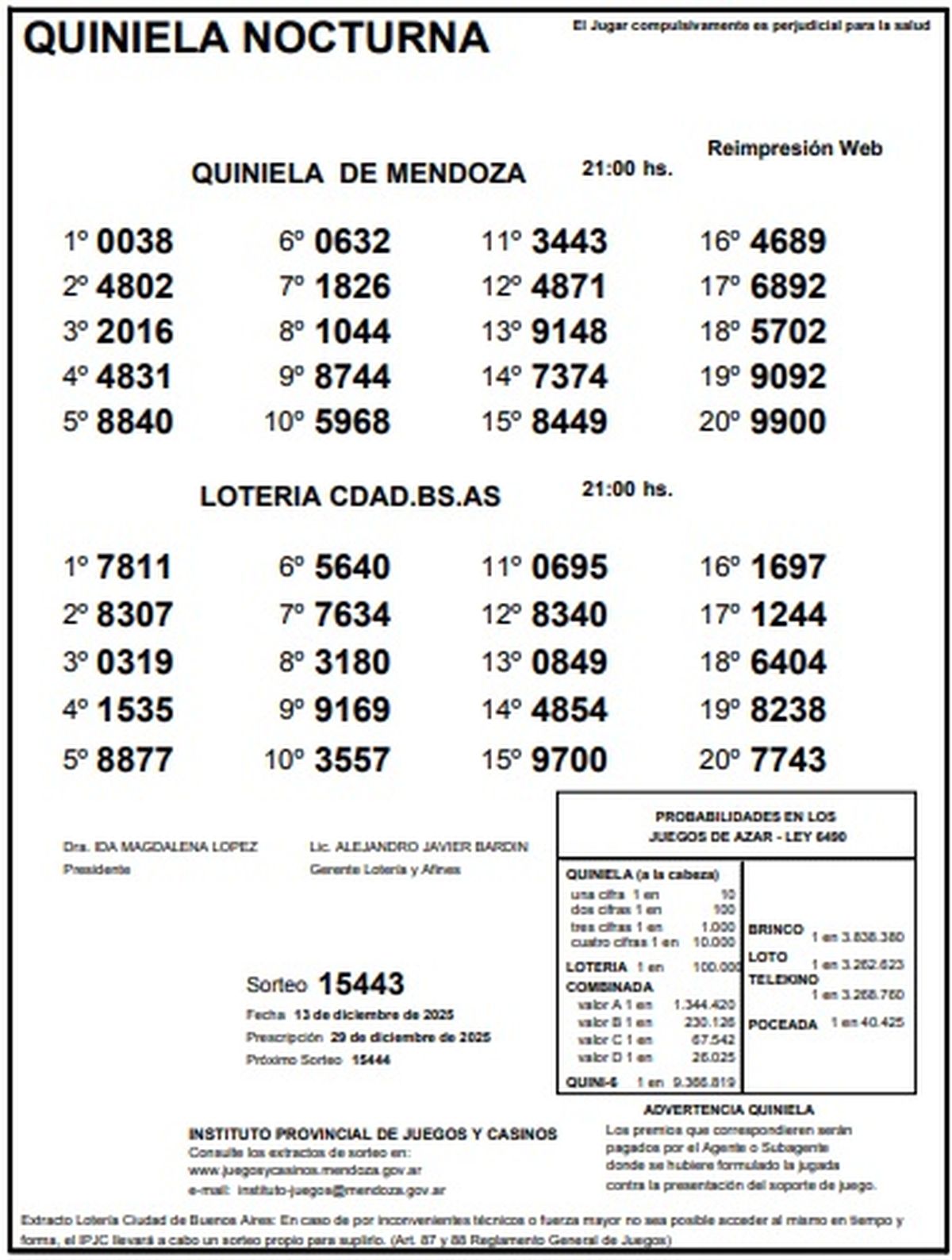 Quiniela de Mendoza: resultados de la Nocturna de este sábado, 13 de diciembre de 2025