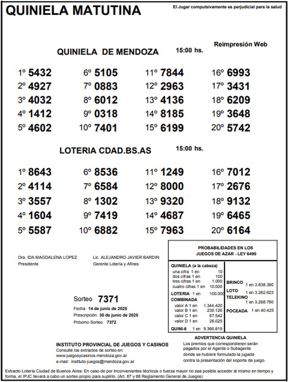 Resultados Quiniela de Mendoza: La Matutina del 14 de junio de 2025