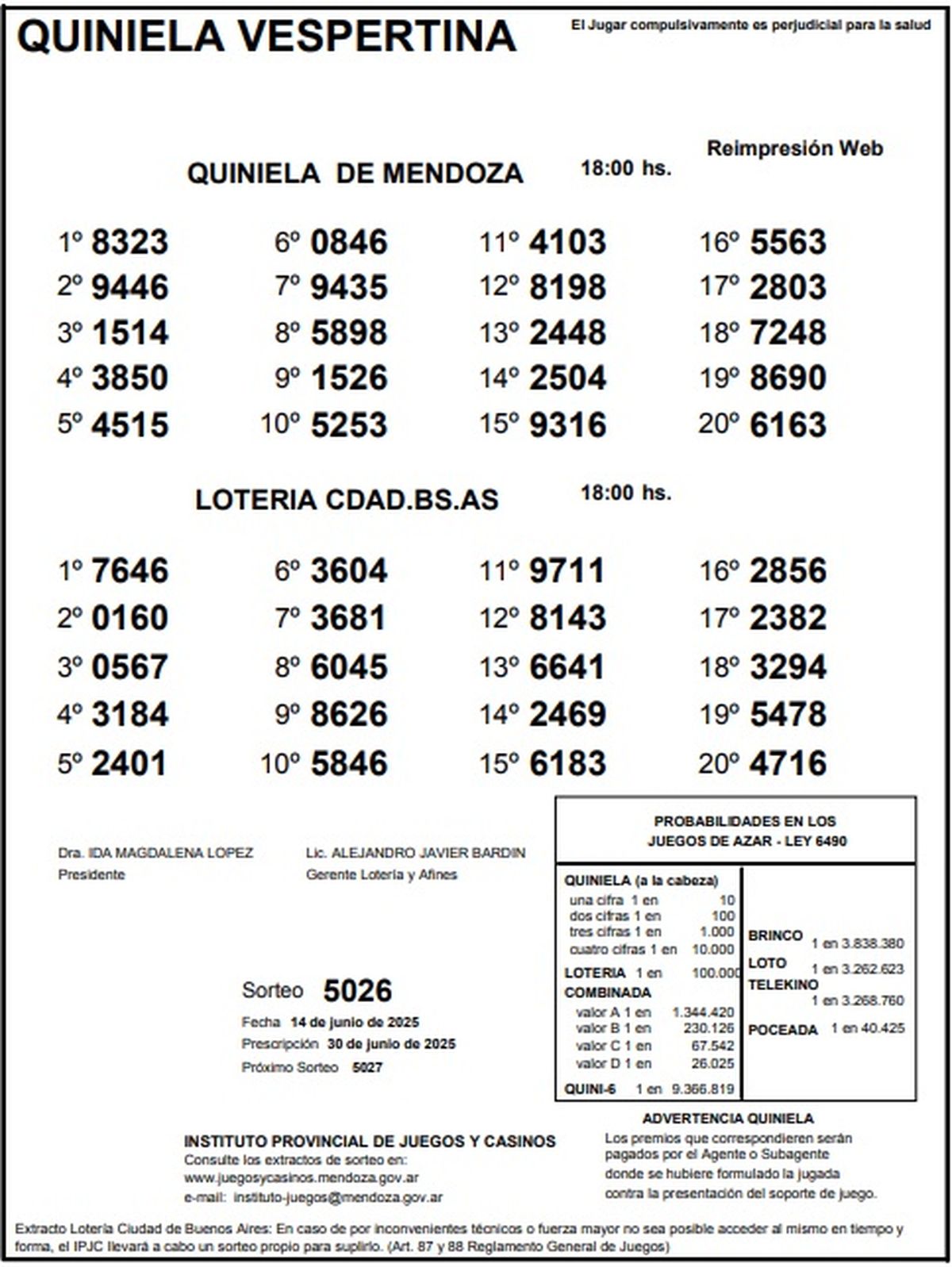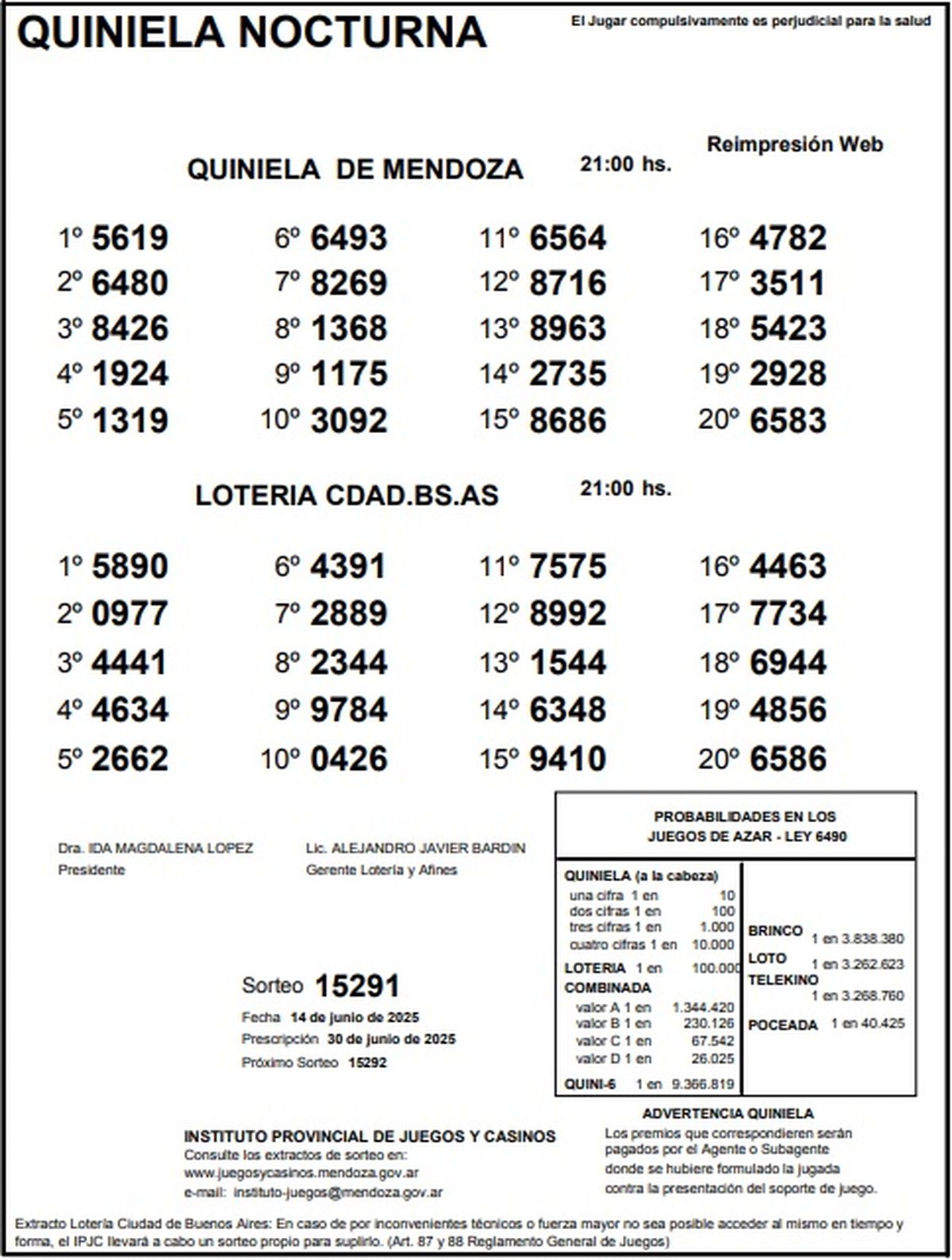 Resultados Quiniela de Mendoza: La Vespertina del 14 de junio de 2025