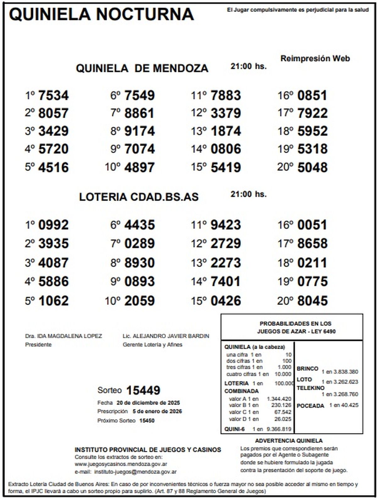 Quiniela de Mendoza: resultados de la Nocturna de este sábado, 20 de diciembre de 2025