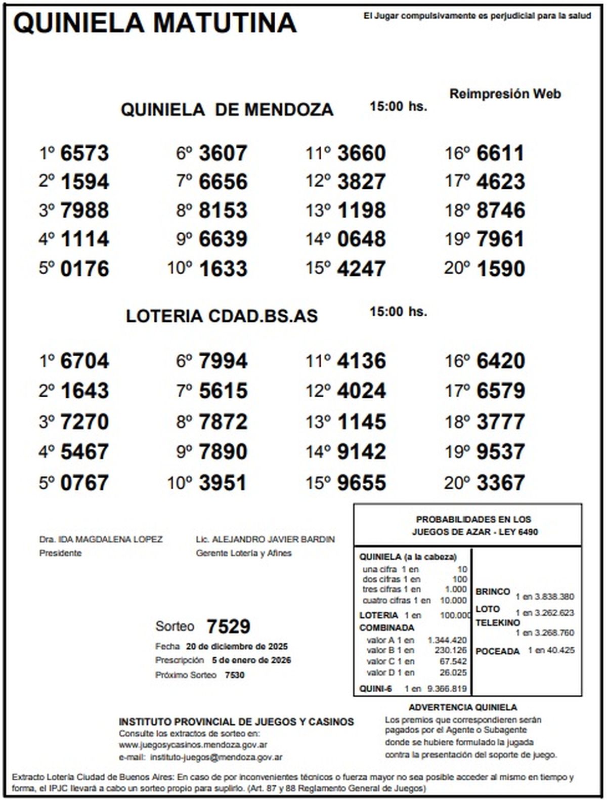 Resultados Quiniela de Mendoza: La Matutina del 20 de diciembre de 2025