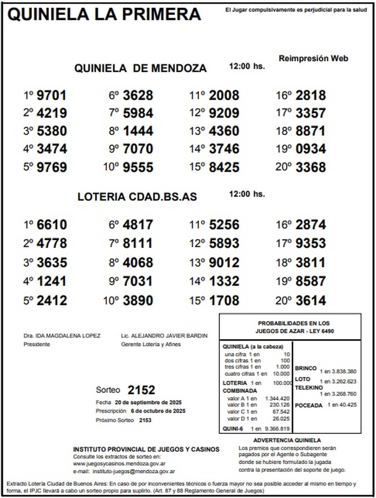Resultados Quiniela de Mendoza: La Primera del 20 de septiembre de 2025