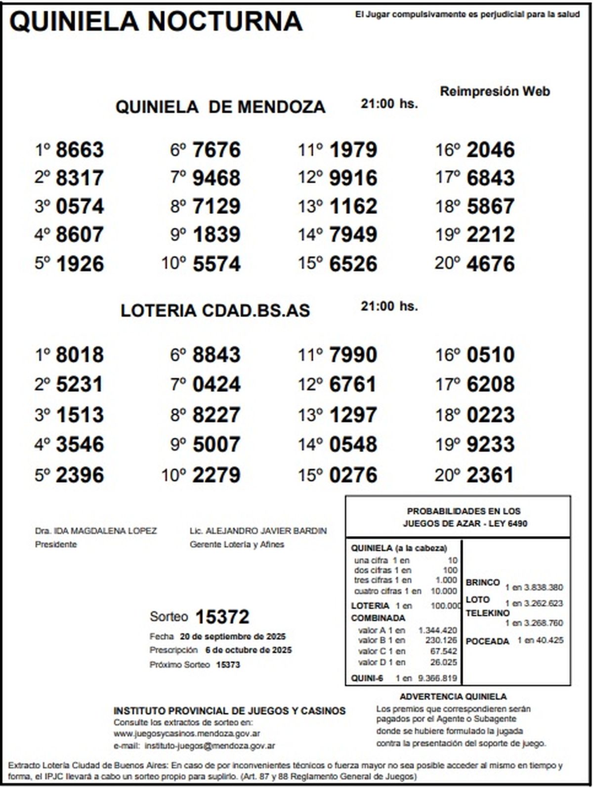 Quiniela de Mendoza: resultados de la Nocturna de este sábado, 20 de septiembre de 2025