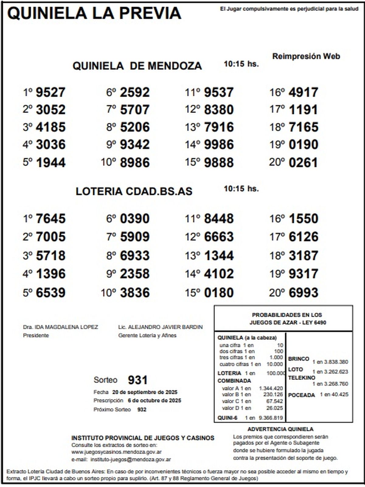 Resultados Quiniela de Mendoza: La Previa del 20 de septiembre de 2025