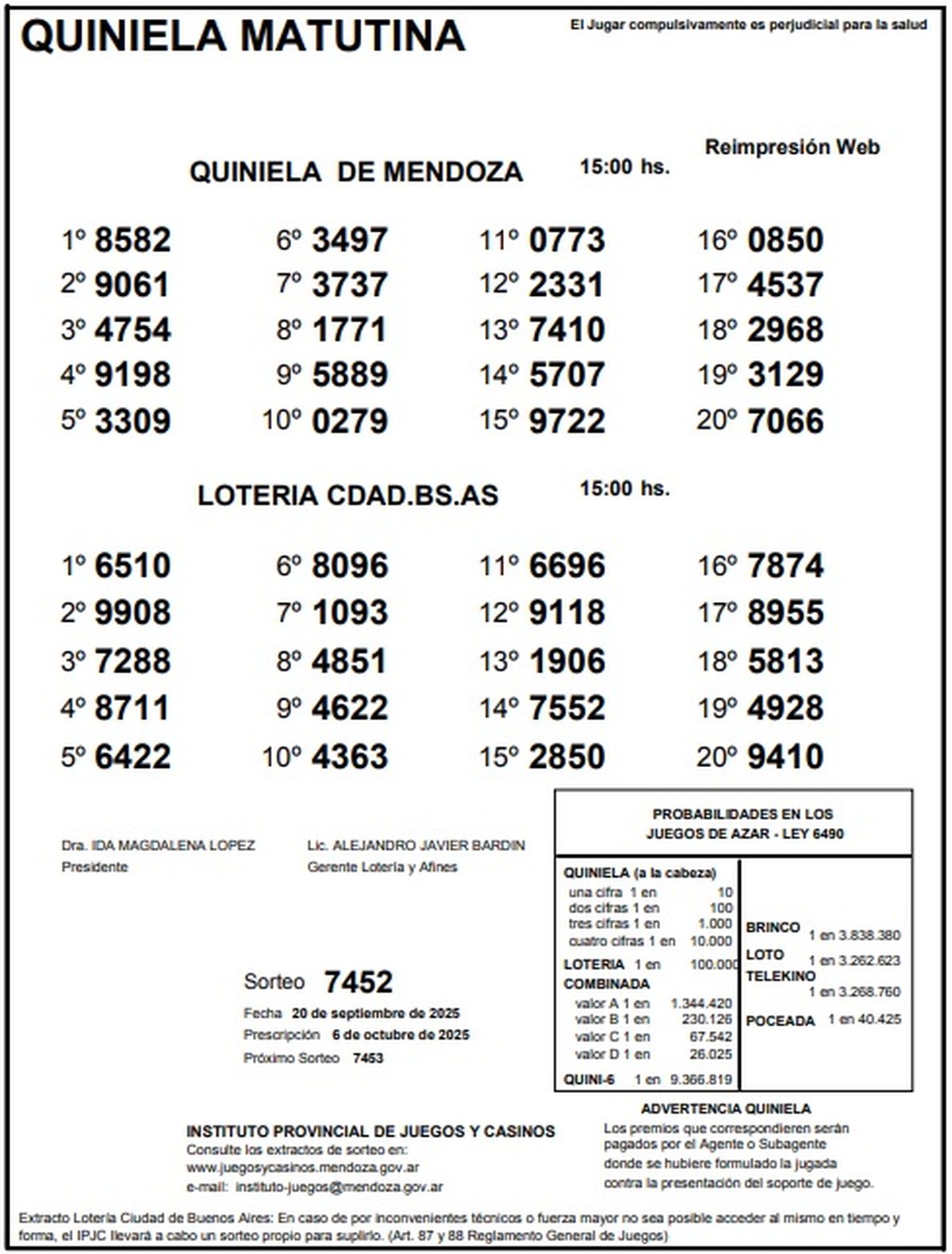 Resultados Quiniela de Mendoza: La Matutina del 20 de septiembre de 2025