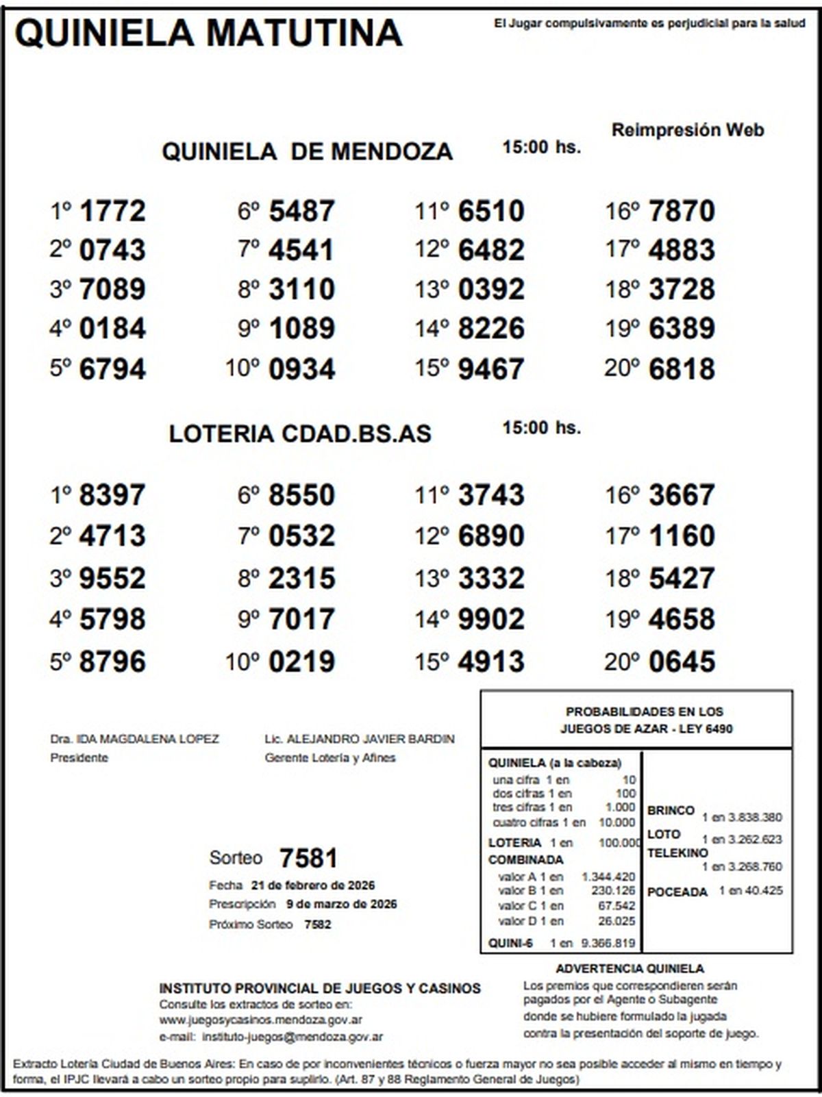 Resultados Quiniela de Mendoza: La Matutina del 21 de febrero de 2026