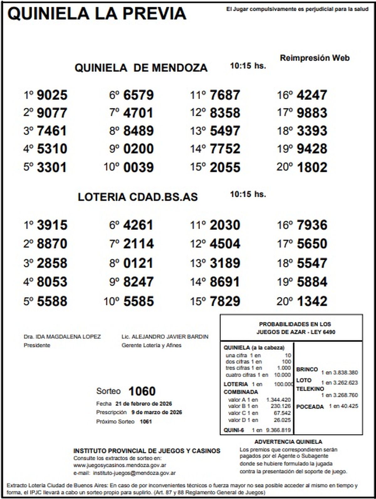 Resultados Quiniela de Mendoza: La Previa del 21 de febrero de 2026